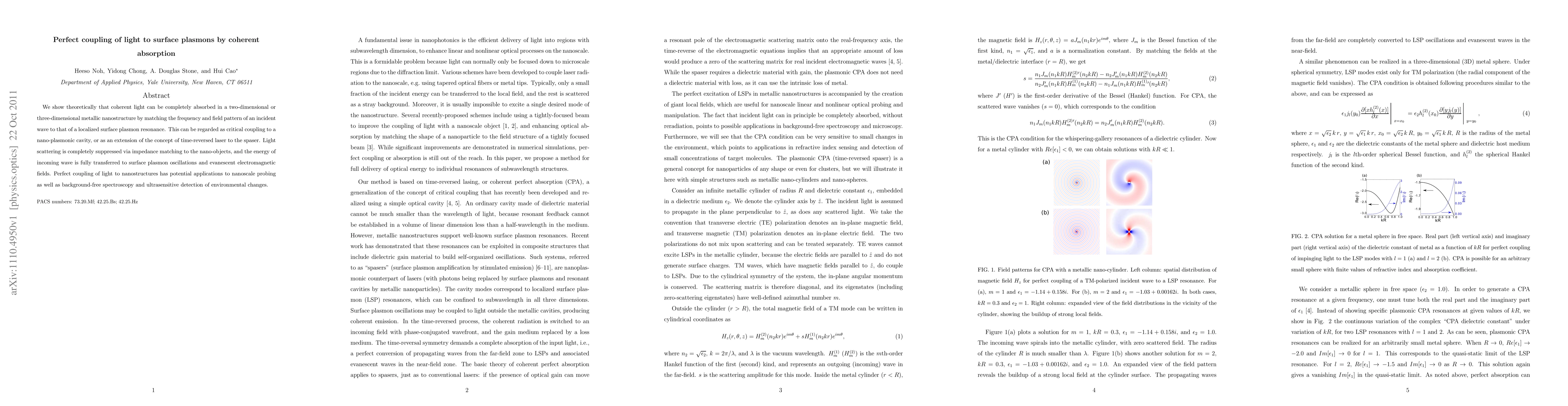 We show theoretically that coherent light can be completely absorbed in a two-dimensional or three-dimensional metallic nanostructure by matching the frequency and field pattern of an incident wave to that of a localized surface plasmon resonance. This can be regarded as critical coupling to a nano-plasmonic cavity, or as an extension of the concept of time-reversed laser to the spaser. Light scattering is completely suppressed via impedance matching to the nano-objects, and the energy of incoming wave is fully transferred to surface plasmon oscillations and evanescent electromagnetic fields. Perfect coupling of light to nanostructures has potential applications to nanoscale probing as well as background-free spectroscopy and ultrasensitive detection of environmental changes.