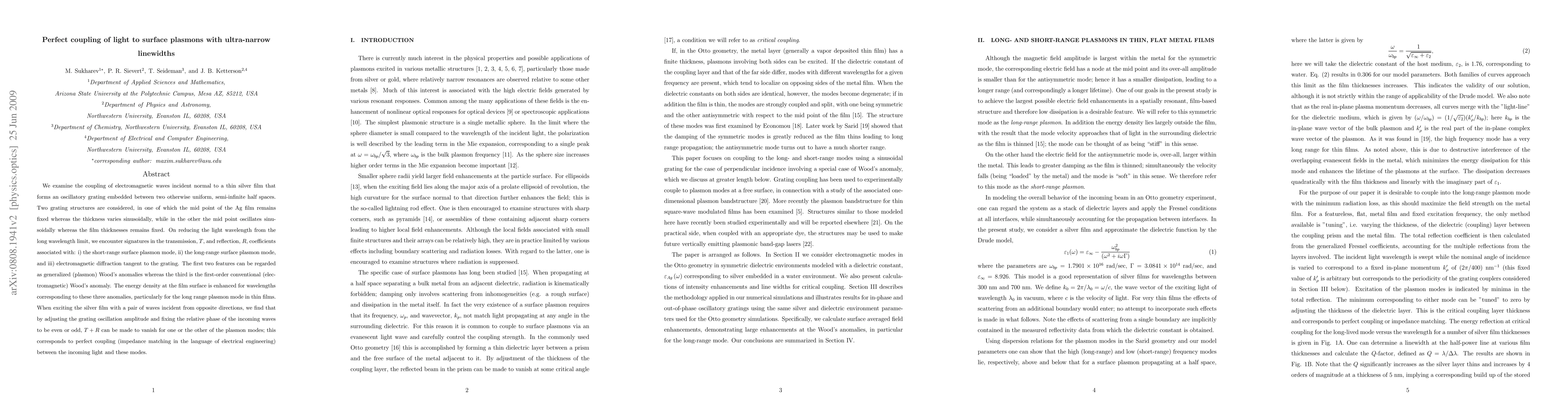 This research demonstrates perfect coupling of light to surface plasmons in a thin silver film grating structure, achieved by adjusting grating oscillation amplitude and wave phase. This results in ultra-narrow linewidths and enhanced energy density at the film surface, with potential implications for optical devices.