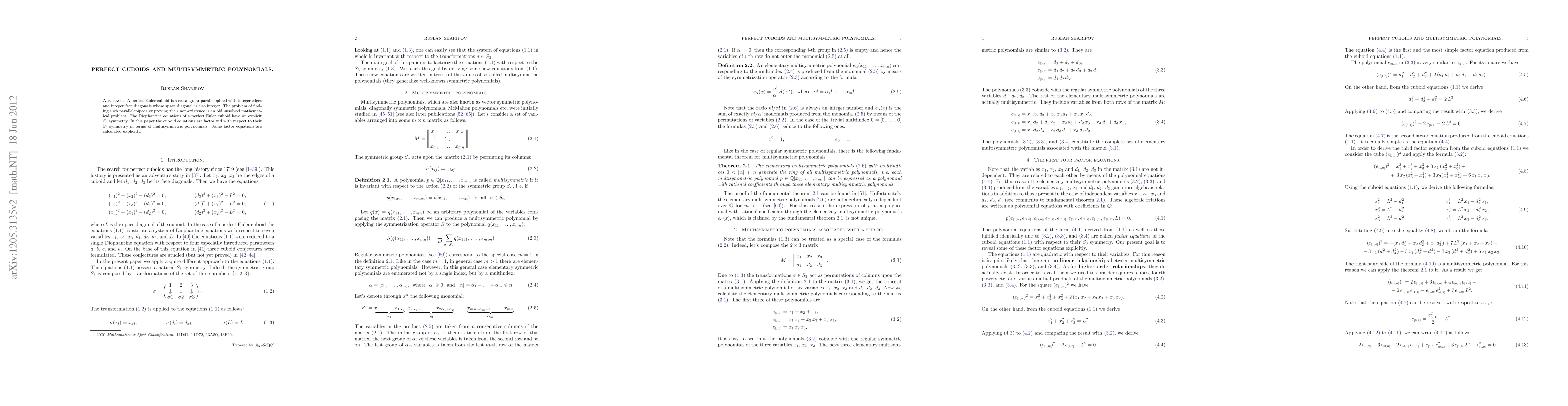 This paper investigates perfect Euler cuboids, rectangular parallelepipeds with integer dimensions and diagonals, and explores their Diophantine equations. It factors these equations using multisymmetric polynomials, revealing $S_3$ symmetry and explicitly calculating some factor equations.