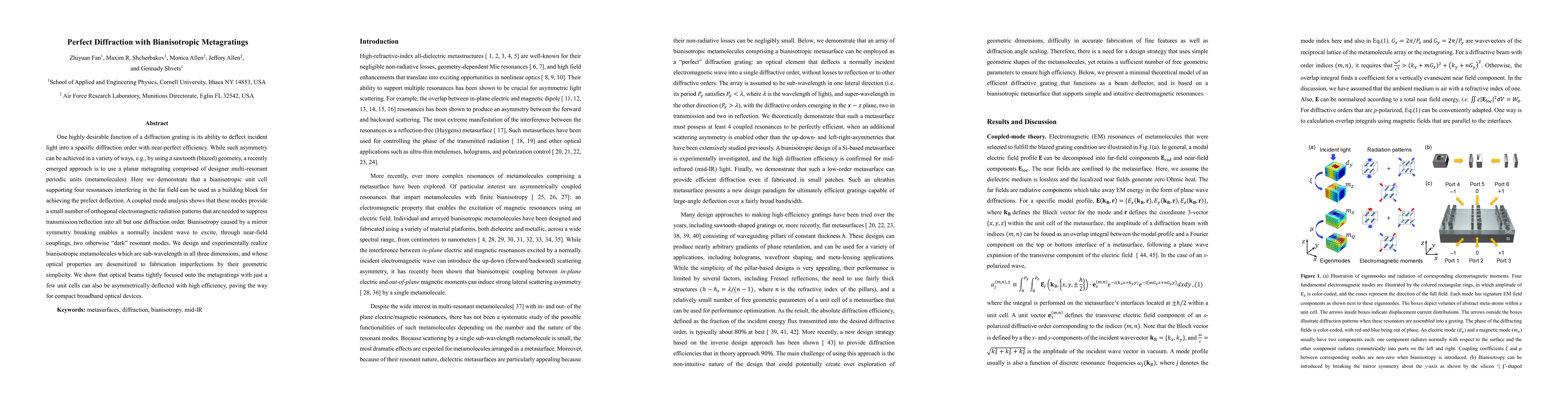 One highly desirable function of a diffraction grating is its ability to deflect incident light into a specific diffraction order with near-perfect efficiency. While such asymmetry can be achieved in a variety of ways, e.g., by using a sawtooth (blazed) geometry, a recently emerged approach is to use a planar metagrating comprised of designer multi-resonant periodic units (metamolecules). Here we demonstrate that a bianisotropic unit cell supporting four resonances interfering in the far field can be used as a building block for achieving the prefect deflection. A coupled mode analysis shows that these modes provide a small number of orthogonal electromagnetic radiation patterns that are needed to suppress transmission/reflection into all but one diffraction order. Bianisotropy caused by a mirror symmetry breaking enables a normally incident wave to excite, through near-field couplings, two otherwise "dark" resonant modes. We design and experimentally realize bianisotropic metamolecules which are sub-wavelength in all three dimensions, and whose optical properties are desensitized to fabrication imperfections by their geometric simplicity. We show that optical beams tightly focused onto the metagratings with just a few unit cells can also be asymmetrically deflected with high efficiency, paving the way for compact broadband optical devices.