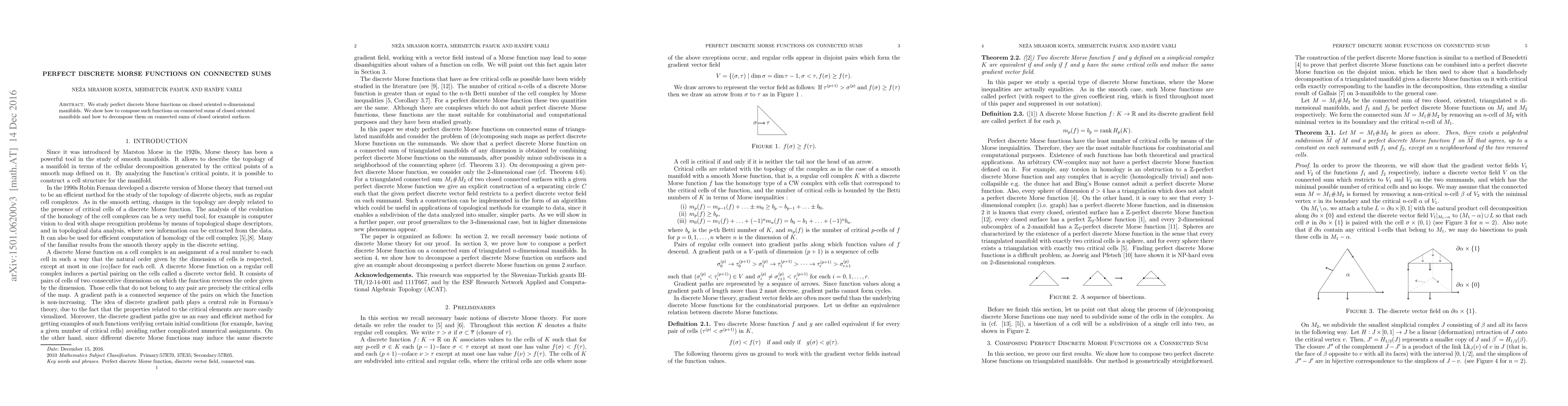 This paper investigates perfect discrete Morse functions on closed oriented n-dimensional manifolds, demonstrating methods for composing these functions on connected sums and decomposing them on connected sums of surfaces.