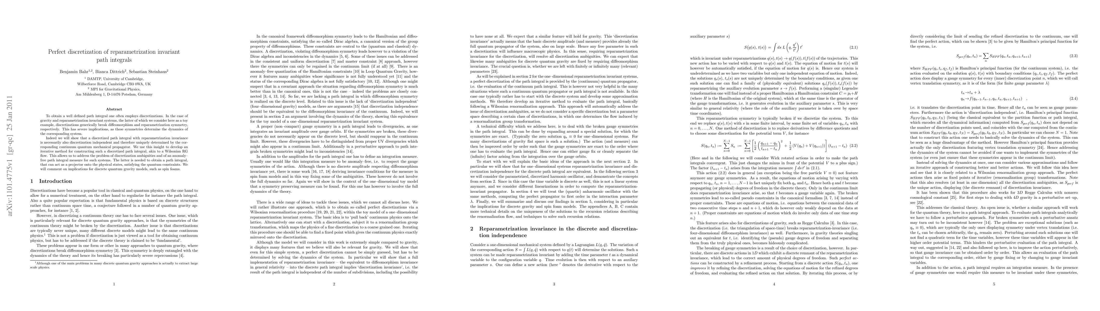 To obtain a well defined path integral one often employs discretizations. In the case of gravity and reparametrization invariant systems, the latter of which we consider here as a toy example, discretizations generically break diffeomorphism and reparametrization symmetry, respectively. This has severe implications, as these symmetries determine the dynamics of the corresponding system. Indeed we will show that a discretized path integral with reparametrization invariance is necessarily also discretization independent and therefore uniquely determined by the corresponding continuum quantum mechanical propagator. We use this insight to develop an iterative method for constructing such a discretized path integral, akin to a Wilsonian RG flow. This allows us to address the problem of discretization ambiguities and of an anomaly--free path integral measure for such systems. The latter is needed to obtain a path integral, that can act as a projector onto the physical states, satisfying the quantum constraints. We will comment on implications for discrete quantum gravity models, such as spin foams.