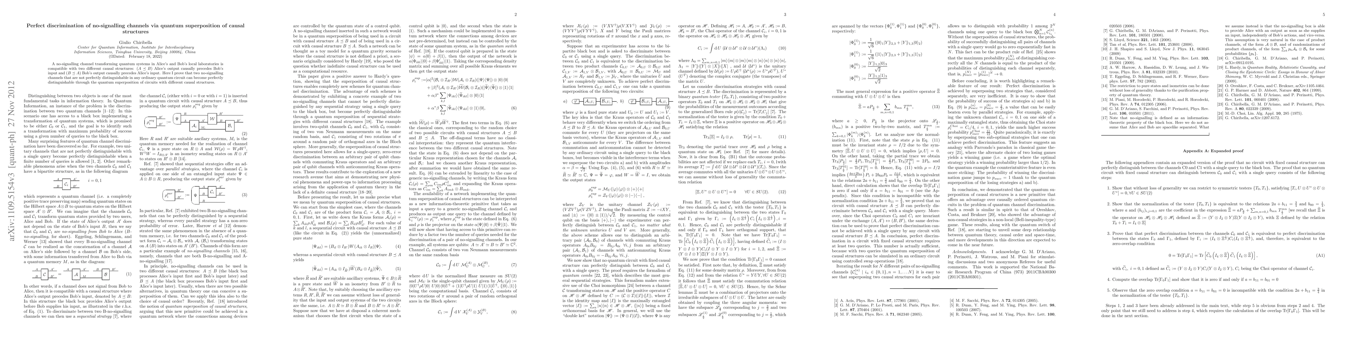 Summary: This paper demonstrates that a quantum superposition of causal structures can perfectly distinguish no-signalling channels that are otherwise indistinguishable using conventional circuits, highlighting a novel approach in quantum information theory.