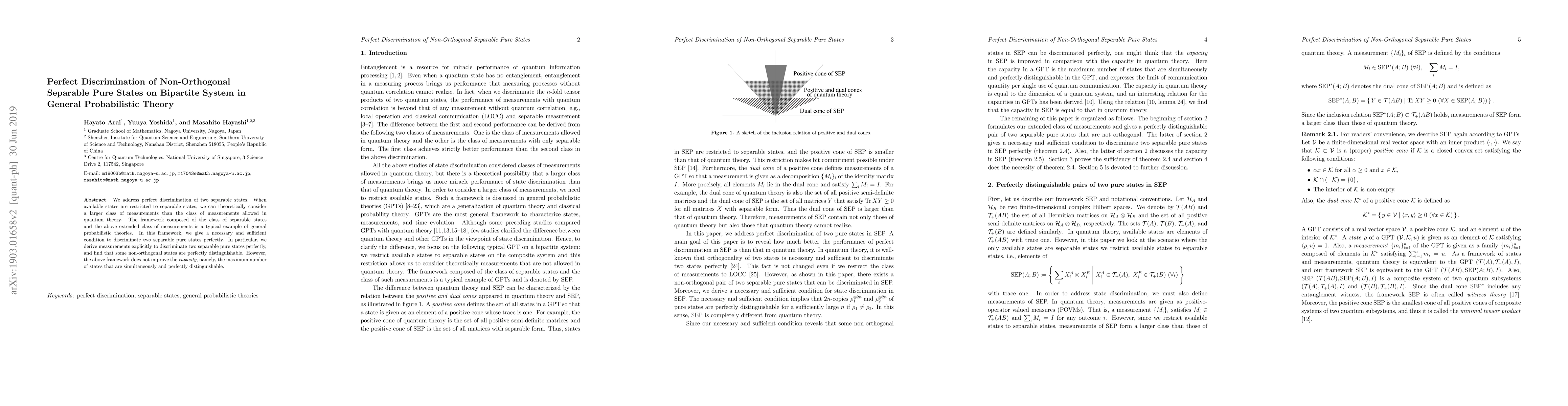 This paper presents a necessary and sufficient condition for perfect discrimination of two separable pure states within general probabilistic theories, demonstrating that some non-orthogonal states can be perfectly distinguished. However, this framework does not enhance the capacity for simultaneously distinguishing multiple states.