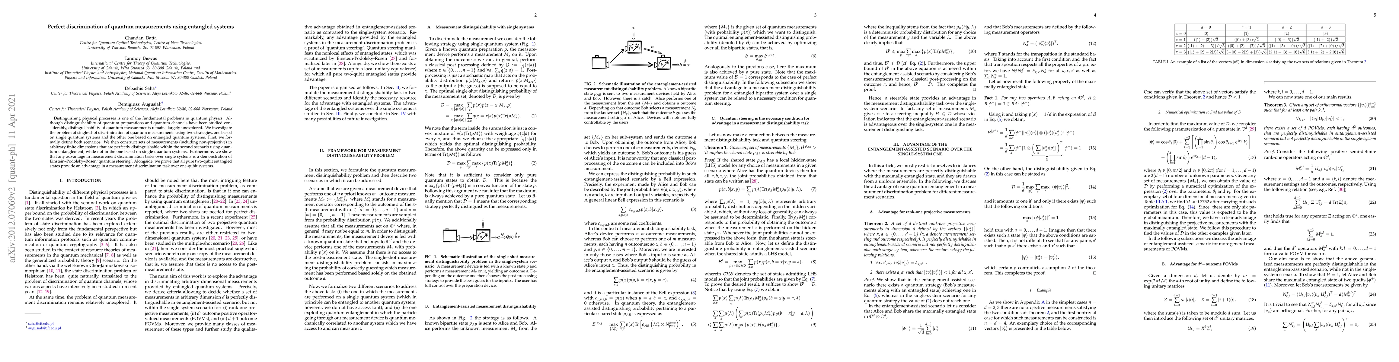 This paper explores the perfect discrimination of quantum measurements, demonstrating that entangled quantum systems outperform single quantum systems in this task. It shows that certain entangled states enable perfect distinguishability of quantum measurements, highlighting the role of quantum steering in this advantage.