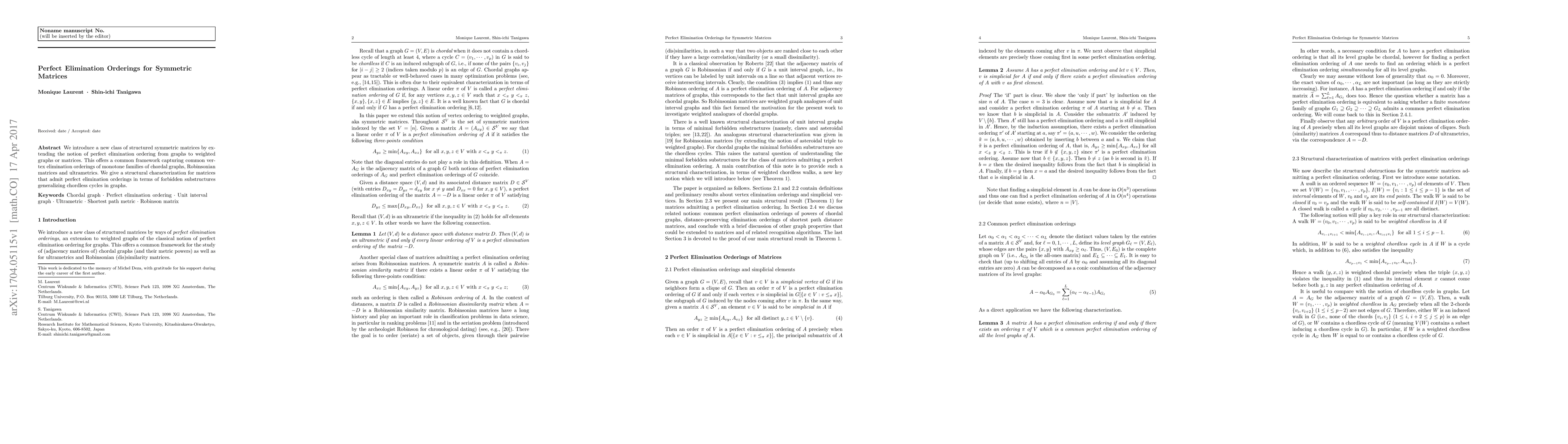 This paper introduces a new class of structured symmetric matrices based on perfect elimination orderings, extending the concept from graphs to weighted graphs. It provides a structural characterization of these matrices in terms of forbidden substructures, generalizing chordless cycles in graphs.