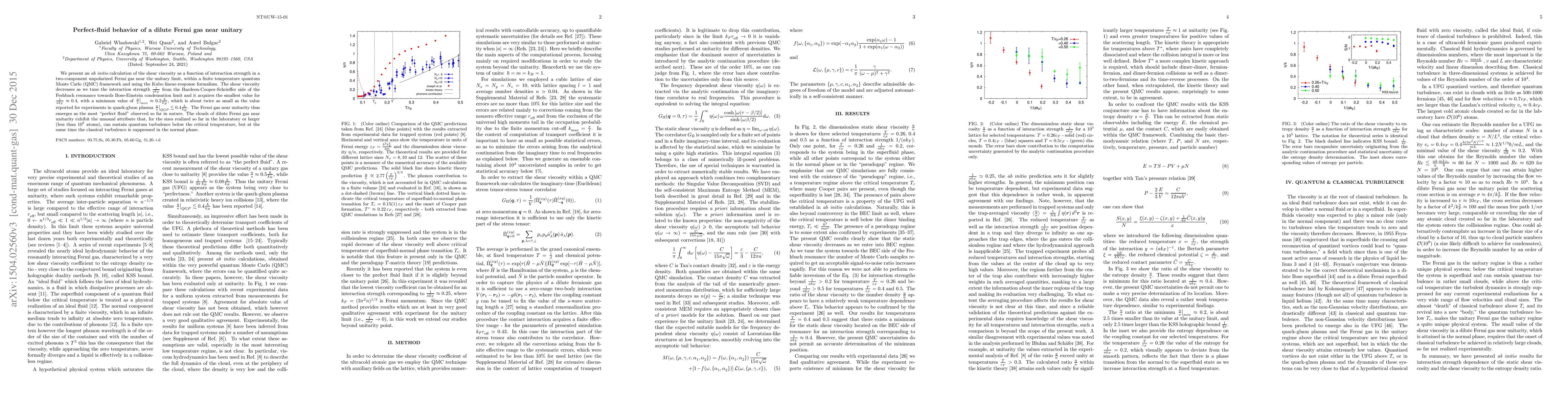 We present an ab initio calculation of the shear viscosity as a function of interaction strength in a two-component unpolarized Fermi gas near the unitary limit, within a finite temperature quantum Monte Carlo (QMC) framework and using the Kubo linear-response formalism. The shear viscosity decreases as we tune the interaction strength 1/ak_F from the Bardeen-Cooper-Schrieffer side of the Feshbach resonance towards Bose-Einstein condensation limit and it acquires the smallest value for 1/ak_F approx 0.4, with a minimum value of (eta/s)_min approx 0.2 hbar/k_B, which is about twice as small as the value reported for experiments in quark-gluon plasma (eta/s)_QGP lesssim 0.4 hbar/k_B. The Fermi gas near unitarity thus emerges as the most "perfect fluid" observed so far in nature. The clouds of dilute Fermi gas near unitarity exhibit the unusual attribute that, for the sizes realized so far in the laboratory or larger (less than 10^9 atoms), can sustain quantum turbulence below the critical temperature, but at the same time the classical turbulence is suppressed in the normal phase.