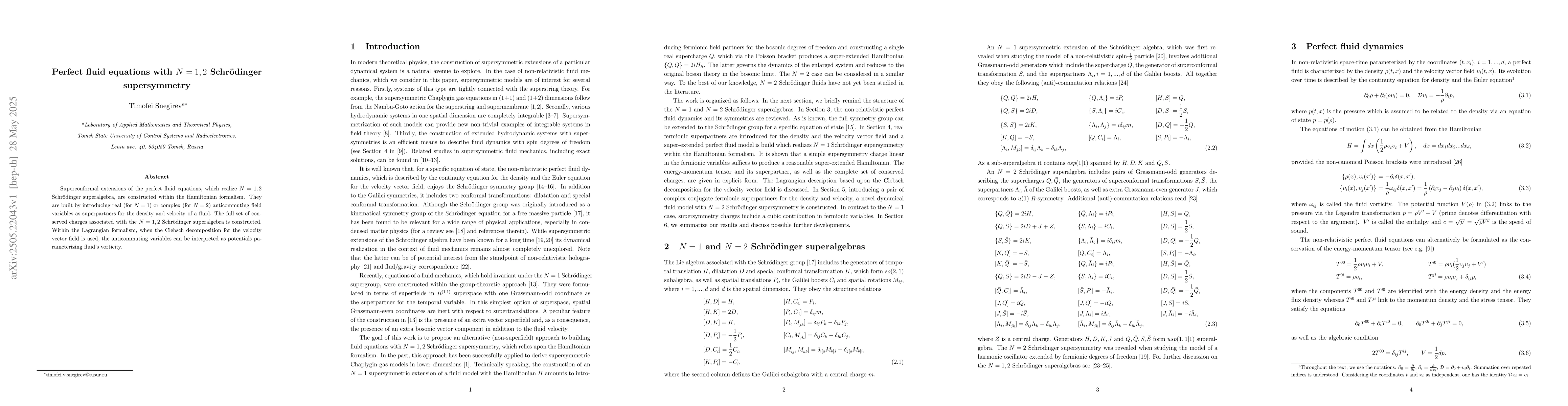 The research constructs superconformal extensions of perfect fluid equations realizing N=1,2 Schrodinger superalgebra within Hamiltonian formalism, introducing anticommuting field variables as superpartners for fluid density and velocity.