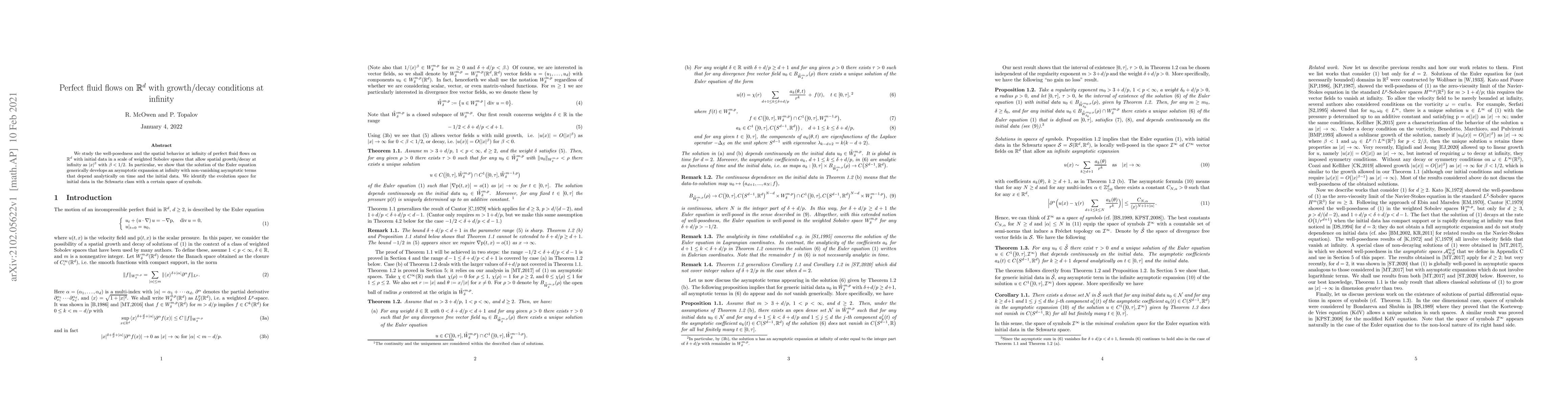 We study the well-posedness and the spatial behavior at infinity of perfect fluid flows on $\R^d$ with initial data in a scale of weighted Sobolev spaces that allow spatial growth/decay at infinity as $|x|^\beta$ with $\beta<1/2$. In particular, we show that the solution of the Euler equation generically develops an asymptotic expansion at infinity with non-vanishing asymptotic terms that depend analytically on time and the initial data. We identify the evolution space for initial data in the Schwartz class with a certain space of symbols.