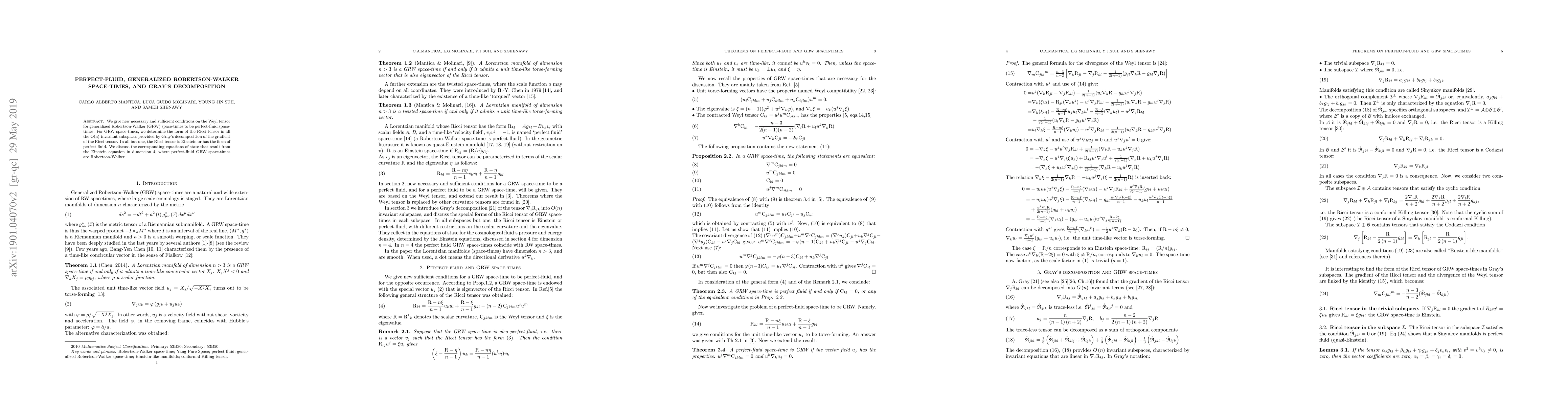 We give new necessary and sufficient conditions on the Weyl tensor for generalized Robertson-Walker (GRW) space-times to be perfect-fluid space-times. For GRW space-times, we determine the form of the Ricci tensor in all the O(n)-invariant subspaces provided by Gray's decomposition of the gradient of the Ricci tensor. In all but one, the Ricci tensor is Einstein or has the form of perfect fluid. We discuss the corresponding equations of state that result from the Einstein equation in dimension 4, where perfect-fluid GRW space-times are Robertson-Walker.