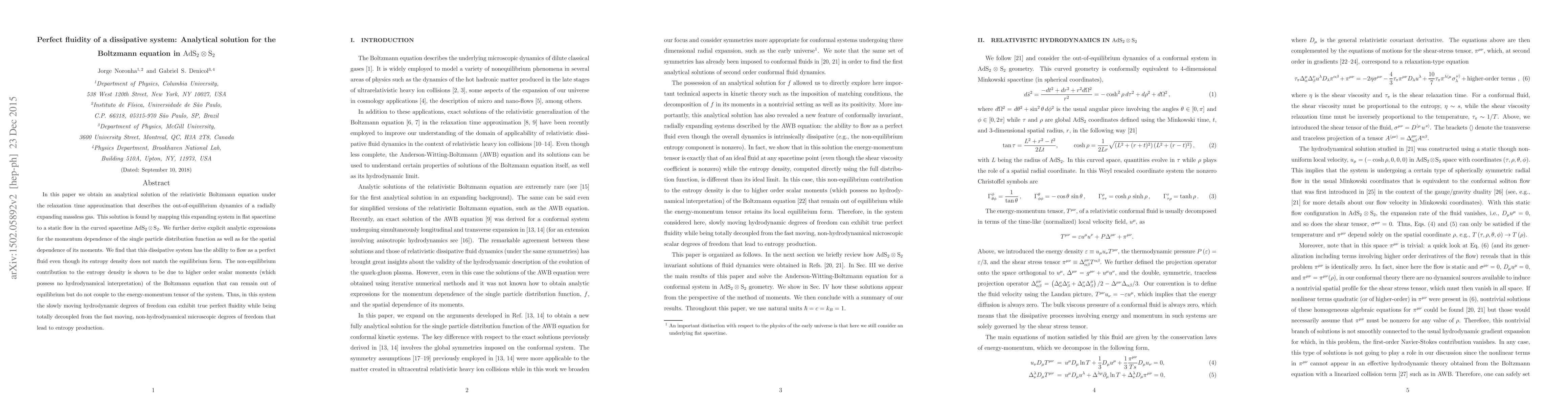 This paper provides an analytical solution for the relativistic Boltzmann equation in $\mathrm{AdS}_{2}\otimes \mathrm{S}_{2}$, revealing that a dissipative system can exhibit perfect fluidity despite non-equilibrium conditions, with entropy production stemming from non-hydrodynamical moments.