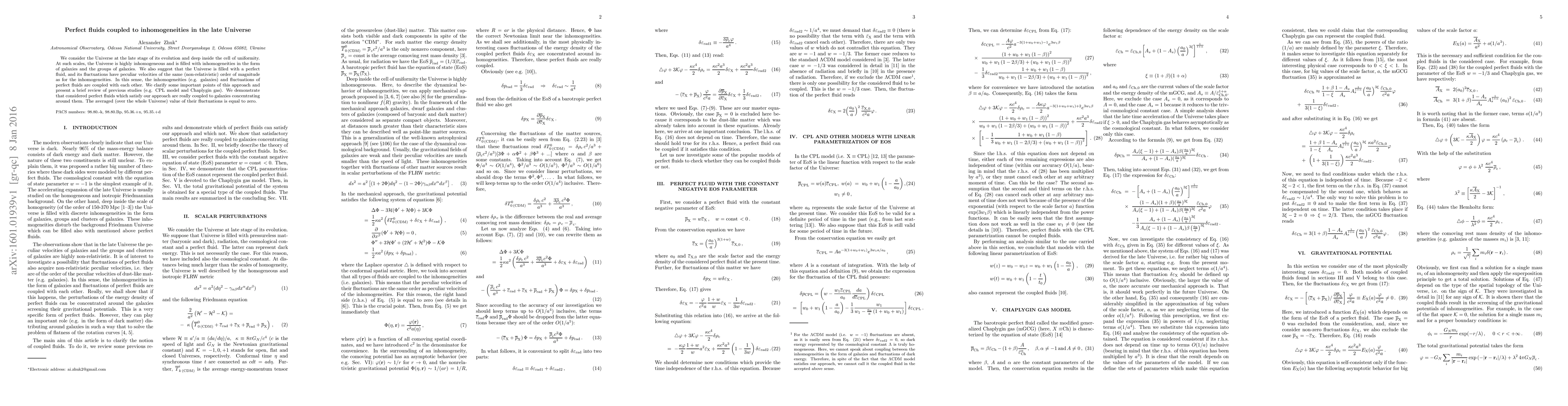 We consider the Universe at the late stage of its evolution and deep inside the cell of uniformity. At such scales, the Universe is highly inhomogeneous and is filled with inhomogeneities in the form of galaxies and the groups of galaxies. We also suggest that the Universe is filled with a perfect fluid, and its fluctuations have peculiar velocities of the same (non-relativistic) order of magnitude as for the inhomogeneities. In this sense, the inhomogeneities (e.g. galaxies) and fluctuations of perfect fluids are coupled with each other. We clarify some important points of this approach and present a brief review of previous studies (e.g. CPL model and Chaplygin gas). We demonstrate that considered perfect fluids which satisfy our approach are really coupled to galaxies concentrating around them. The averaged (over the whole Universe) value of their fluctuations is equal to zero.