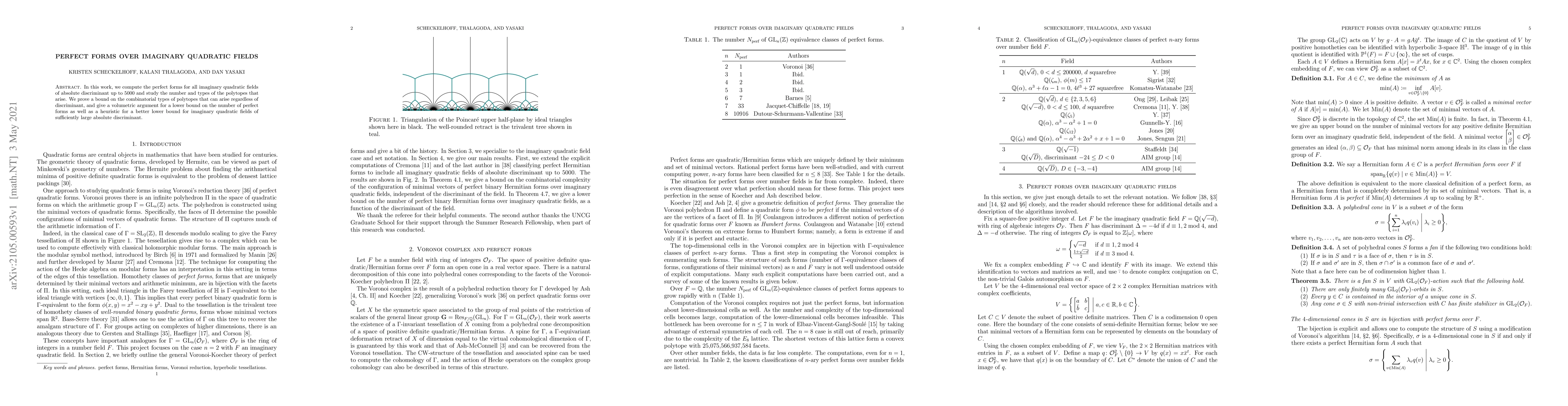 This paper computes perfect forms for imaginary quadratic fields up to a discriminant of 5000 and analyzes the resulting polytopes, proving a bound on their combinatorial types and providing a volumetric argument for the lower bound of perfect forms, along with a heuristic for larger discriminants.