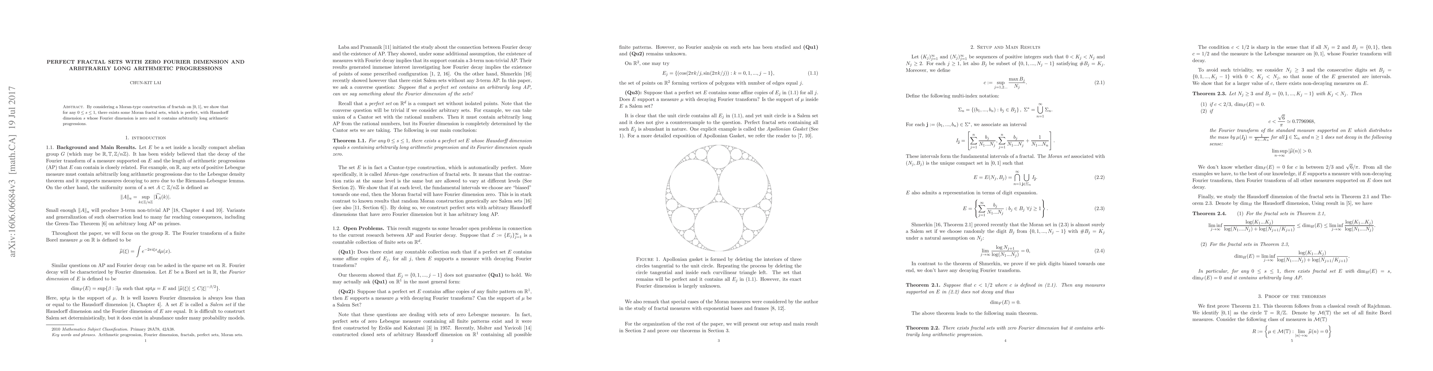By considering a Moran-type construction of fractals on $[0,1]$, we show that for any $0\le s\le 1$, there exists some Moran fractal set, which is perfect, with Hausdorff dimension $s$ whose Fourier dimension is zero and it contains arbitrarily long arithmetic progressions.