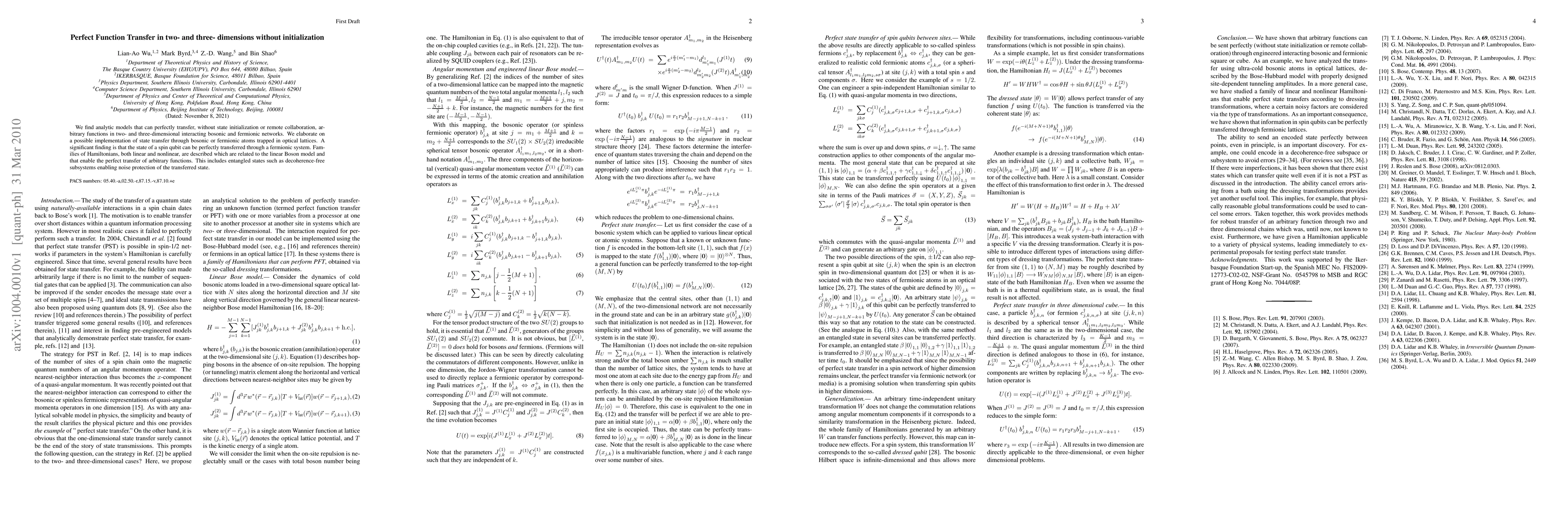 We find analytic models that can perfectly transfer, without state initializati$ or remote collaboration, arbitrary functions in two- and three-dimensional interacting bosonic and fermionic networks. We elaborate on a possible implementation of state transfer through bosonic or fermionic atoms trapped in optical lattices. A significant finding is that the state of a spin qubit can be perfectly transferred through a fermionic system. Families of Hamiltonians, both linear and nonlinear, are described which are related to the linear Boson model and that enable the perfect transfer of arbitrary functions. This includes entangled states such as decoherence-free subsystems enabling noise protection of the transferred state.