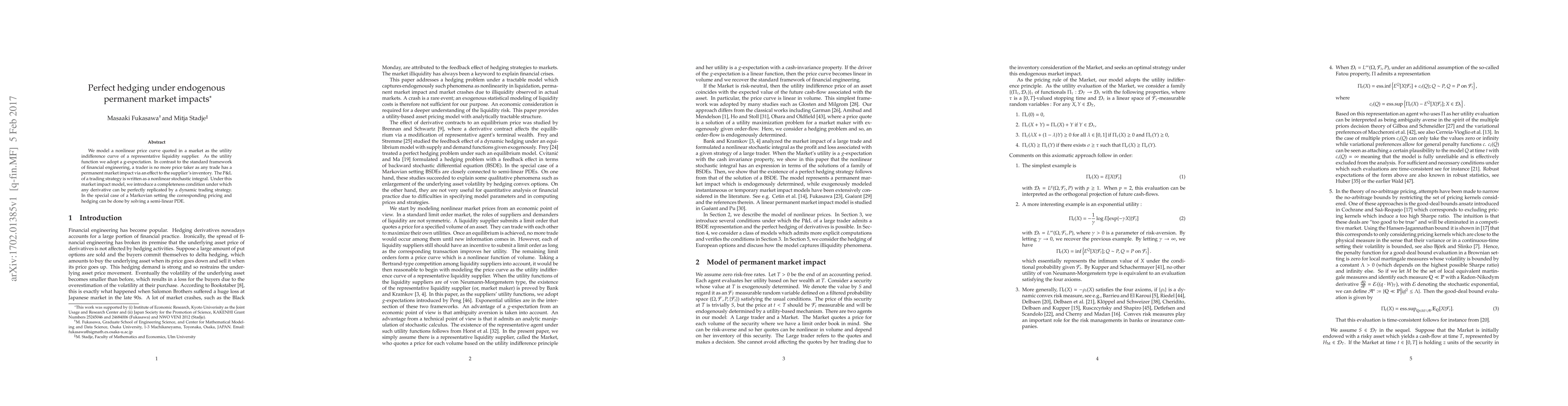 This paper models market price dynamics as the utility indifference curve of a liquidity supplier, considering permanent market impacts from trades. It introduces a g-expectation utility function and proves perfect hedging under a completeness condition, with a semi-linear PDE approach for Markovian settings.