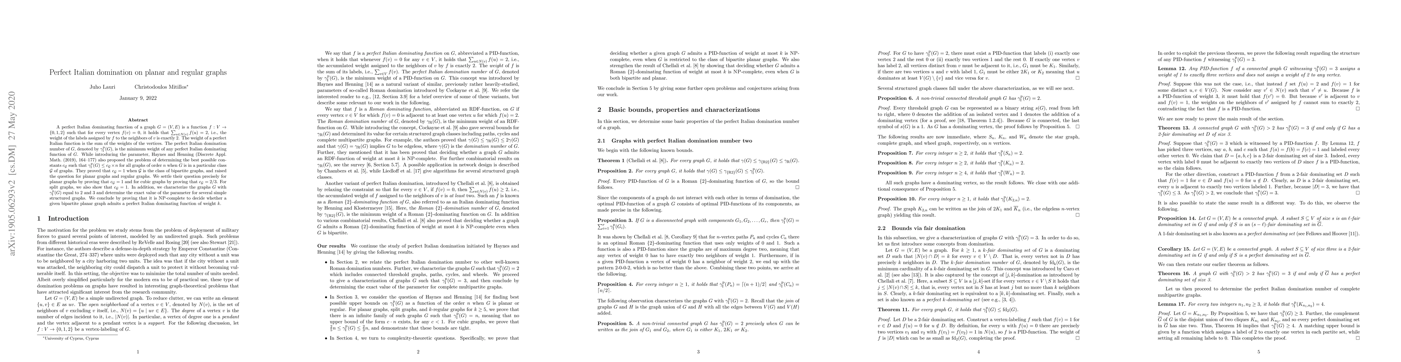 A perfect Italian dominating function of a graph $G=(V,E)$ is a function $f : V \to \{0,1,2\}$ such that for every vertex $f(v) = 0$, it holds that $\sum_{u \in N(v)} f(u) = 2$, i.e., the weight of the labels assigned by $f$ to the neighbors of $v$ is exactly two. The weight of a perfect Italian function is the sum of the weights of the vertices. The perfect Italian domination number of $G$, denoted by $\gamma^p_I(G)$, is the minimum weight of any perfect Italian dominating function of $G$. While introducing the parameter, Haynes and Henning (Discrete Appl. Math. (2019), 164--177) also proposed the problem of determining the best possible constants $c_\mathcal{G}$ such that $\gamma^p_I(G) \leq c_\mathcal{G} \times n$ for all graphs of order $n$ when $G$ is in a particular class $\mathcal{G}$ of graphs. They proved that $c_\mathcal{G} = 1$ when $\mathcal{G}$ is the class of bipartite graphs, and raised the question for planar graphs and regular graphs. We settle their question precisely for planar graphs by proving that $c_\mathcal{G} = 1$ and for cubic graphs by proving that $c_\mathcal{G} = 2/3$. For split graphs, we also show that $c_\mathcal{G} = 1$. In addition, we characterize the graphs $G$ with $\gamma^p_I(G)$ equal to 2 and 3 and determine the exact value of the parameter for several simple structured graphs. We conclude by proving that it is NP-complete to decide whether a given bipartite planar graph admits a perfect Italian dominating function of weight $k$.