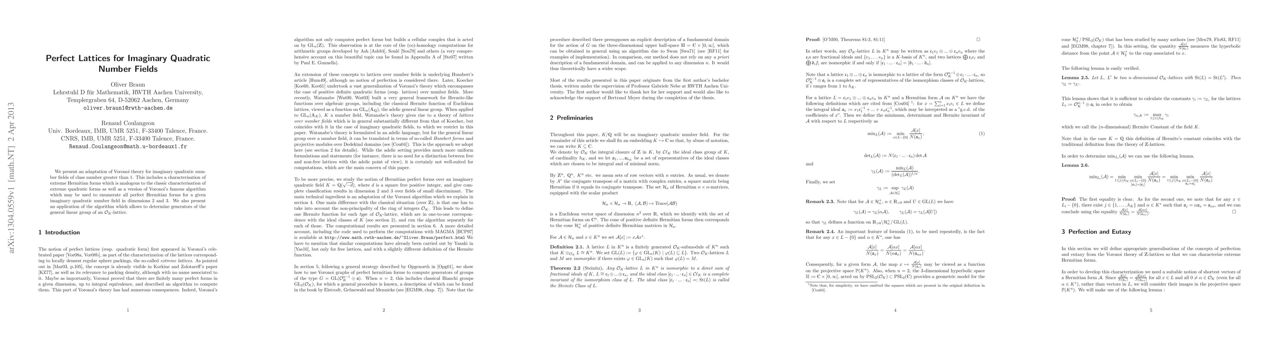 This paper adapts Voronoi theory to imaginary quadratic number fields with class number greater than 1, providing a characterization of extreme Hermitian forms and an algorithm for enumerating perfect Hermitian forms in dimensions 2 and 3. It also applies the algorithm to determine generators of the general linear group of $\O_K$-lattices.