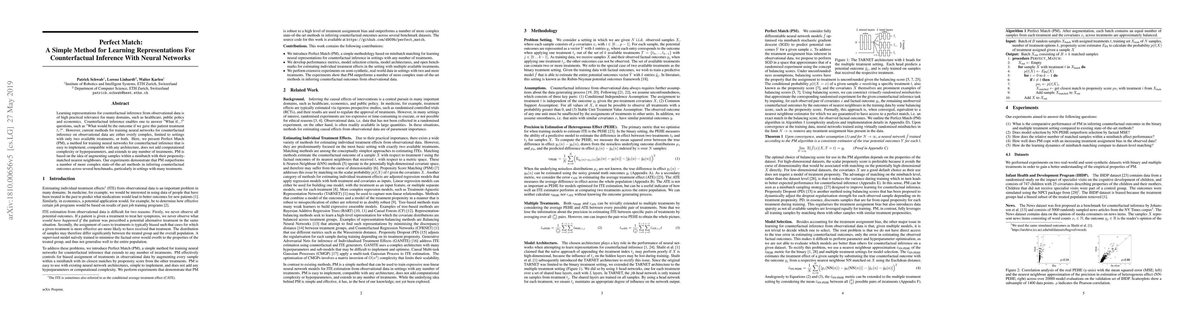 The paper introduces Perfect Match (PM), a straightforward method for training neural networks to perform counterfactual inference, which is effective across various domains and adaptable to any number of treatments without added complexity. PM outperforms existing methods by leveraging propensity-matched nearest neighbors within minibatches.