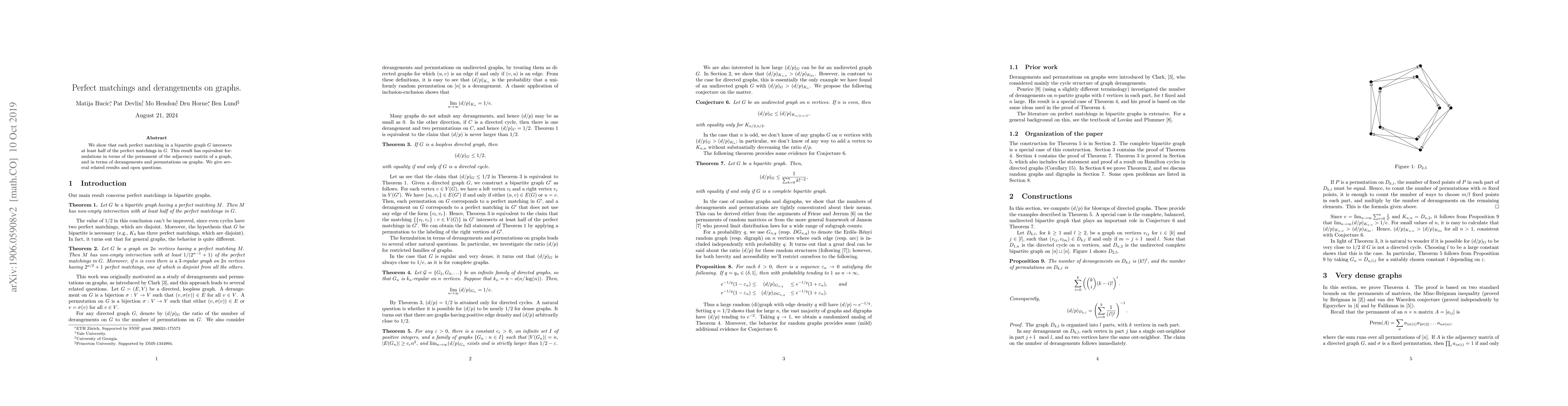 Summary: This paper demonstrates that every perfect matching in a bipartite graph intersects at least half of the other perfect matchings, linking this result to the permanent of the graph's adjacency matrix and exploring connections to derangements and permutations on graphs. It also presents additional findings and poses open questions.