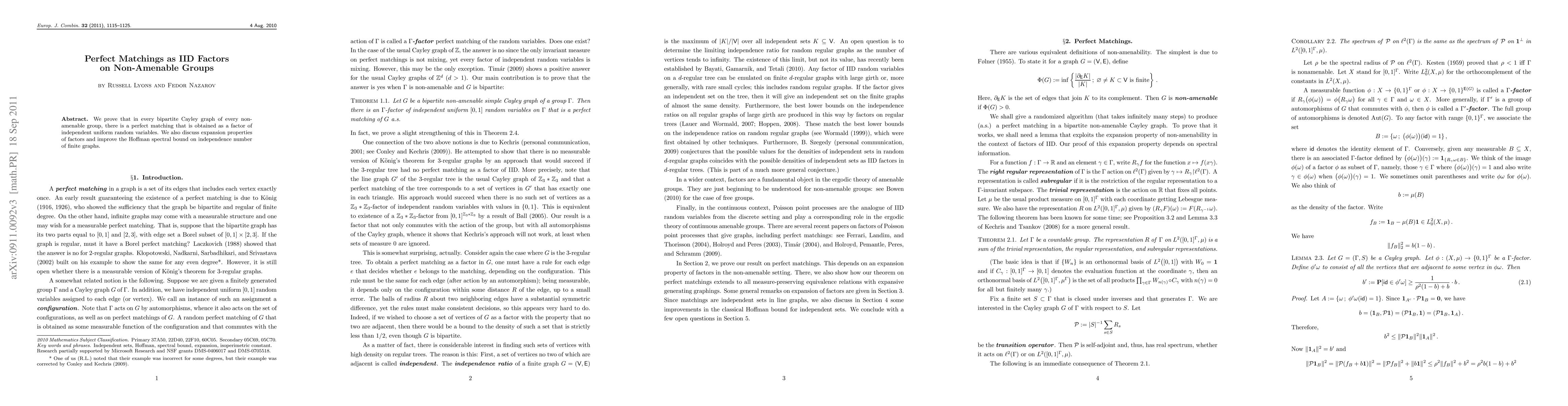 This paper demonstrates that perfect matchings in bipartite Cayley graphs of non-amenable groups arise as factors of independent uniform random variables. It also enhances the Hoffman spectral bound for the independence number of finite graphs and discusses the expansion properties of these factors.