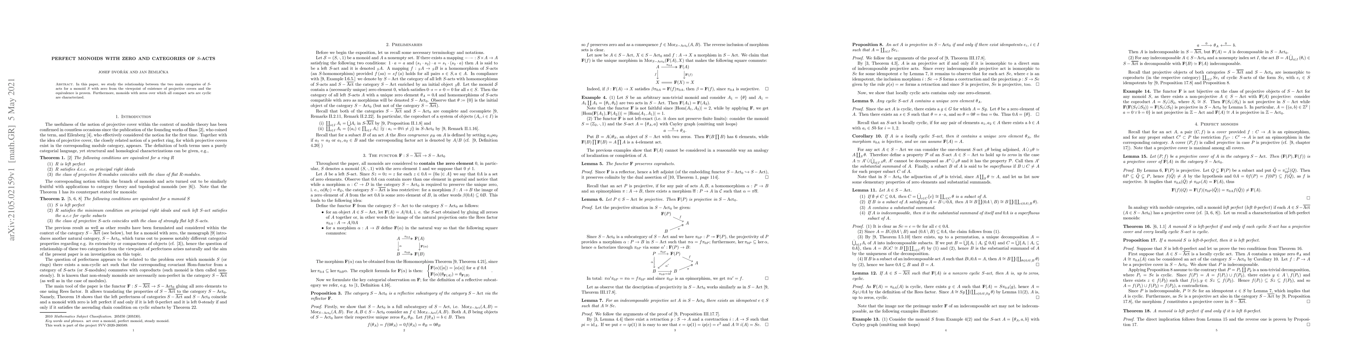 This paper investigates the equivalence between two categories of $S$-acts for monoids $S$ with zero, focusing on the existence of projective covers and proving their equivalence. It also characterizes monoids where all compact acts are cyclic.