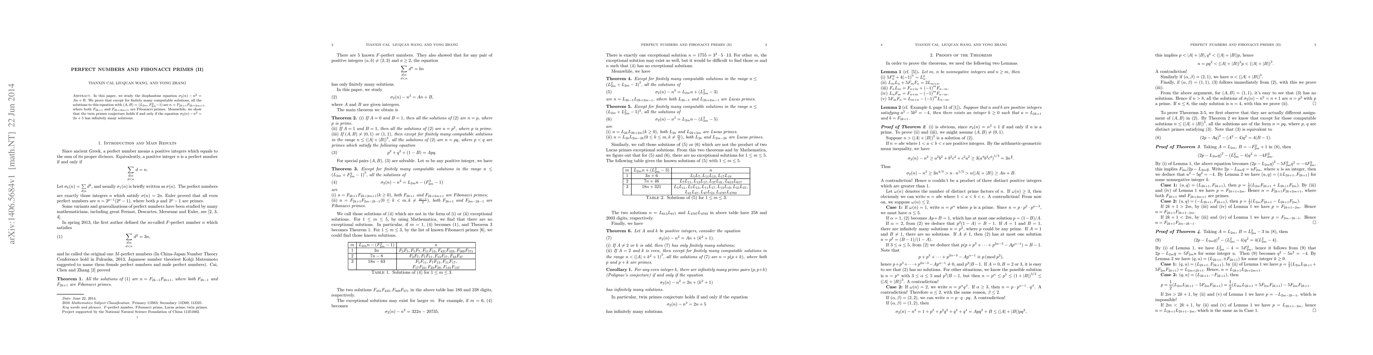 In this paper, we study the diophantine equation ${{\sigma }_{2}}(n)-{{n}^{2}}=An+B$. We prove that except for finitely many computable solutions, all the solutions to this equation with $(A,B)=({{L}_{2m}},F_{2m}^{2}-1)$ are $n={{F}_{2k+1}}{{F}_{2k+2m+1}}$, where both ${{F}_{2k+1}}$ and ${{F}_{2k+2m+1}}$ are Fibonacci primes. Meanwhile, we show that the twin primes conjecture holds if and only if the equation ${{\sigma }_{2}}(n)-{{n}^{2}}=2n+5$ has infinitely many solutions.