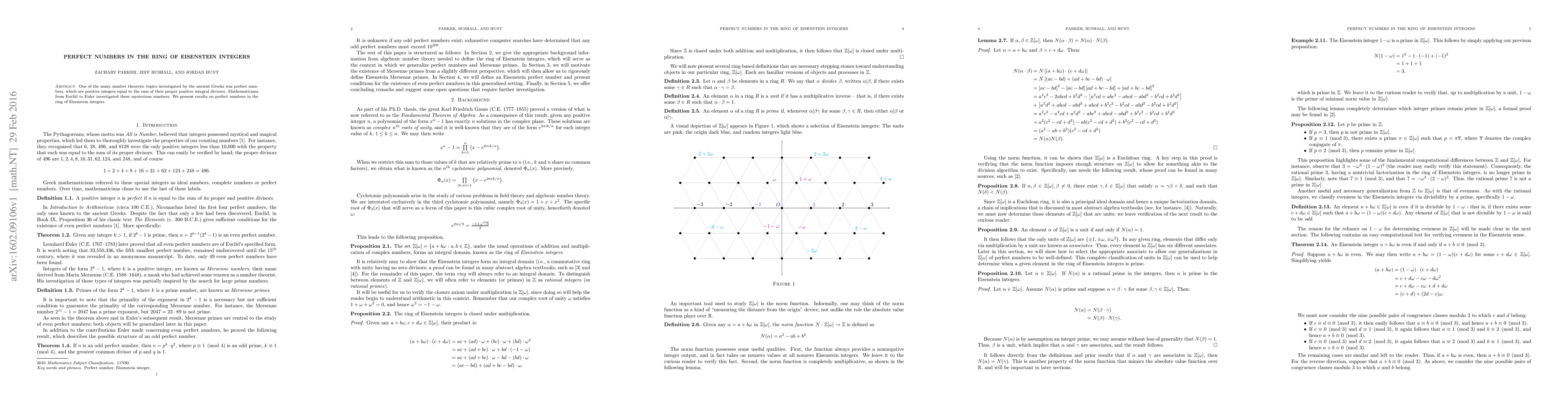 This paper explores the properties of perfect numbers within the ring of Eisenstein integers, extending classical number theory to complex number systems. It investigates how these special integers relate to the sum of their proper divisors in this unique algebraic structure.