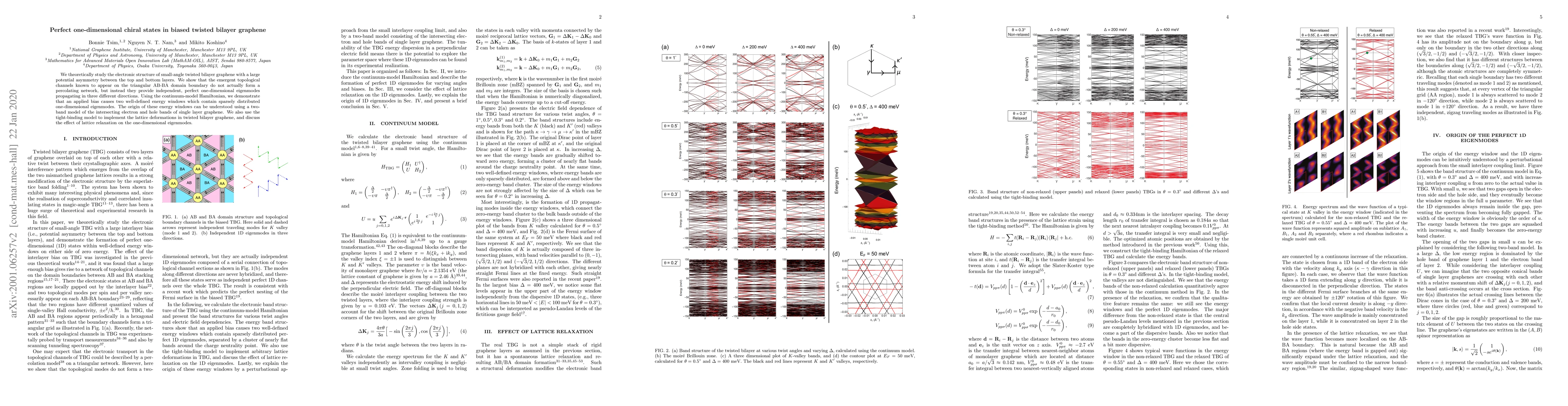 We theoretically study the electronic structure of small-angle twisted bilayer graphene with a large potential asymmetry between the top and bottom layers. We show that the emergent helical states known to appear on the triangular AB-BA domain boundary do not actually form a percolating network, but instead they provide independent, perfect one-dimensional channels propagating in three different directions. Using the continuum-model Hamiltonian, we demonstrate that an applied bias causes two well-defined energy windows which contain sparsely distributed one-dimensional channels. The origin of these energy windows can be understood using a two-band model of the intersecting electron and hole bands of single layer graphene. We also use the tight-binding model to implement the lattice deformations in twisted bilayer graphene, and discuss the effect of lattice relaxation on the one-dimensional channels.