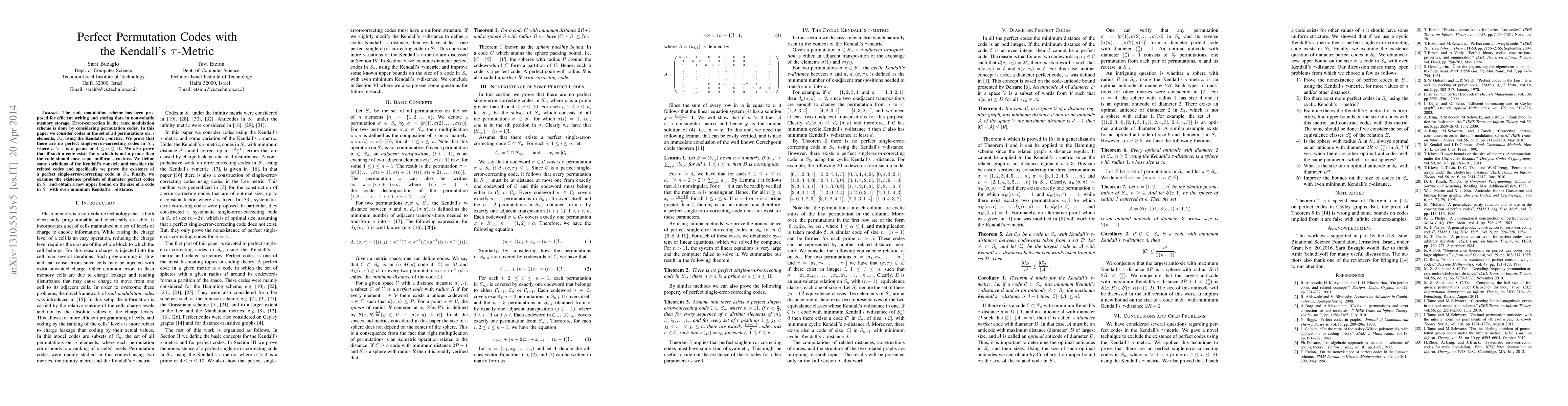 This paper investigates permutation codes in the set of all permutations on $n$ elements, $S_n$, using Kendall's $\tau$-metric for error-correction in rank modulation schemes. It proves the absence of perfect single-error-correcting codes for certain values of $n$ and the existence of a perfect code in $S_5$.