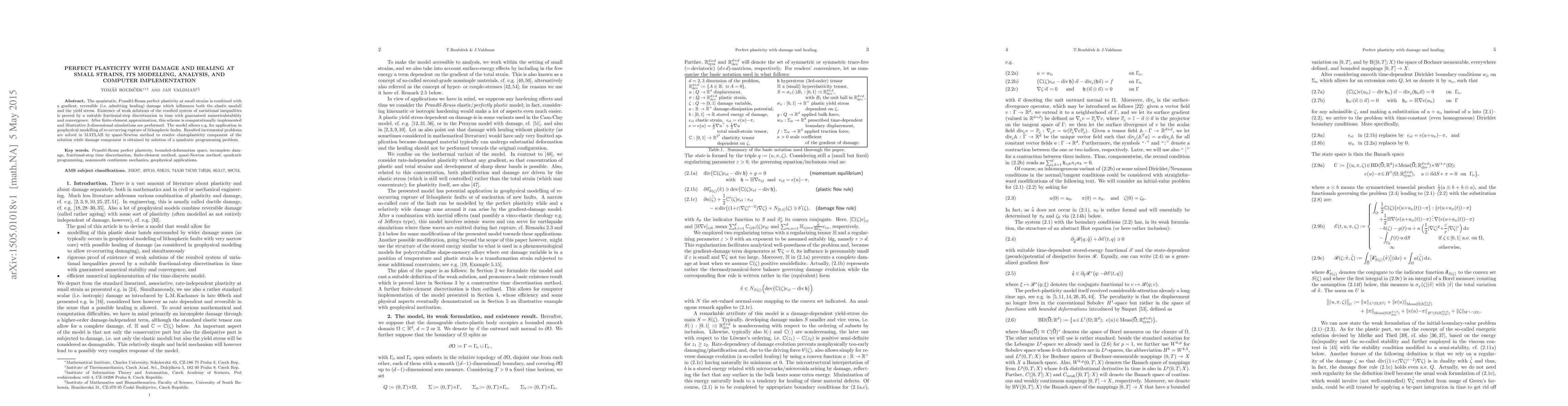 This paper models quasistatic perfect plasticity with reversible damage and healing at small strains, proving the existence of weak solutions through a fractional-step discretisation. It implements the model using finite elements and MATLAB, demonstrating its applicability in geophysical modelling of lithospheric fault ruptures.