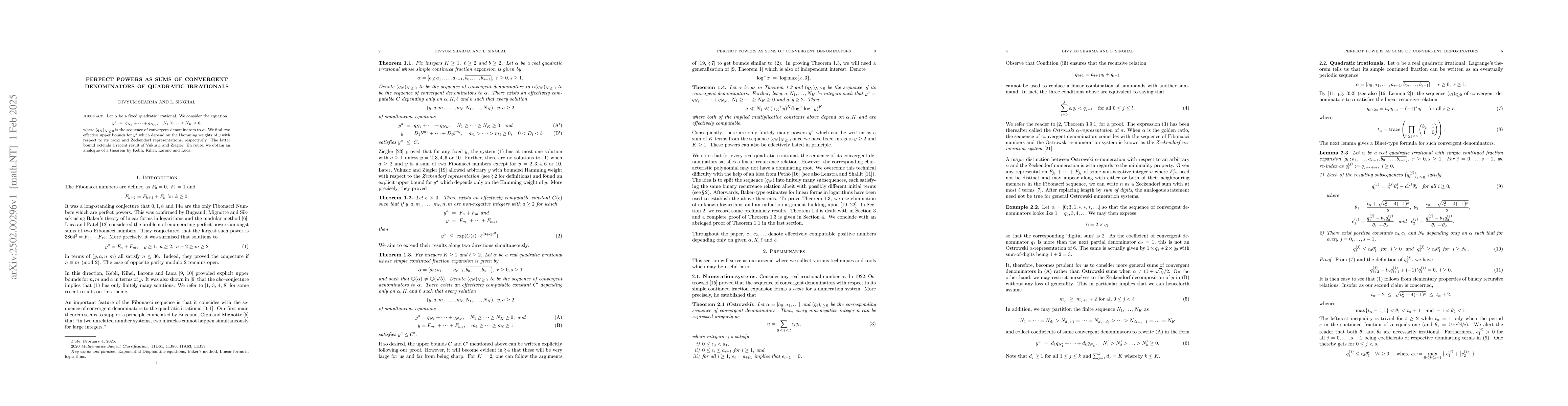This study extends previous work by Vukusic and Ziegler, contributing to the understanding of sums of convergent denominators of quadratic irrationals as perfect powers, with implications for number theory.
