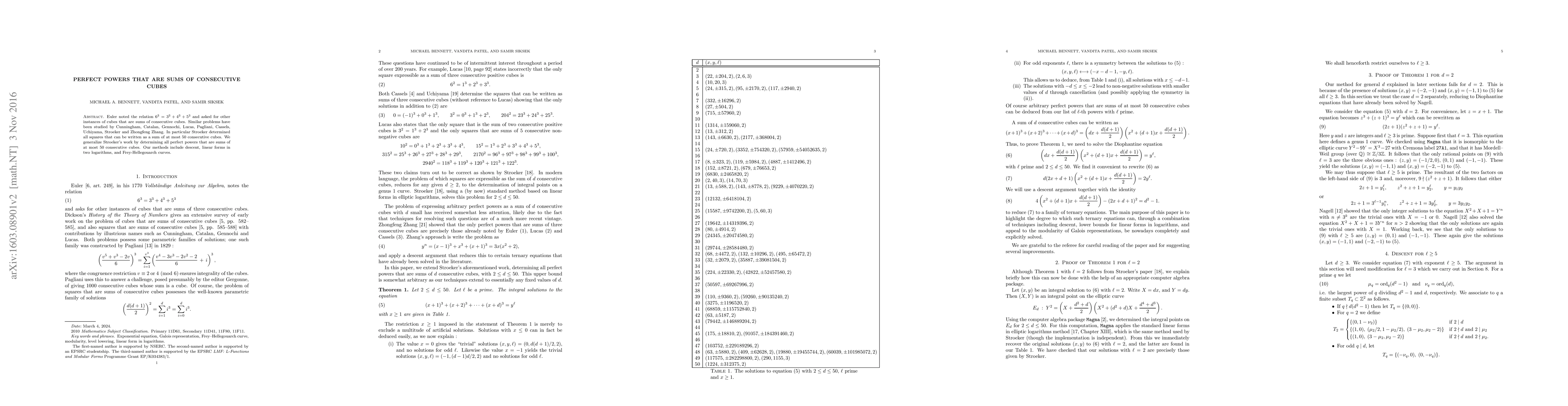 This paper generalizes Stroeker's findings on perfect powers expressible as sums of up to 50 consecutive cubes, employing techniques such as descent, linear forms in two logarithms, and Frey-Hellegouarch curves to achieve its results.