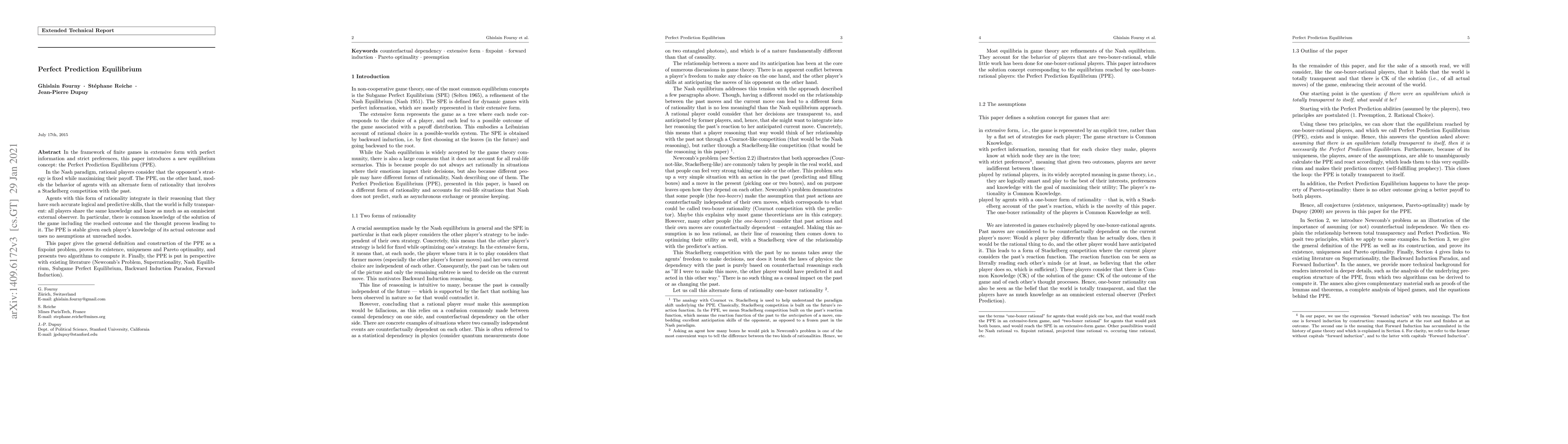 The research introduces a new equilibrium concept, Perfect Prediction Equilibrium (PPE), in finite games with perfect information and strict preferences, modeling a form of rationality involving Stackelberg competition with the past, assuming common knowledge of the game's solution including the reached outcome and the thought process leading to it.
