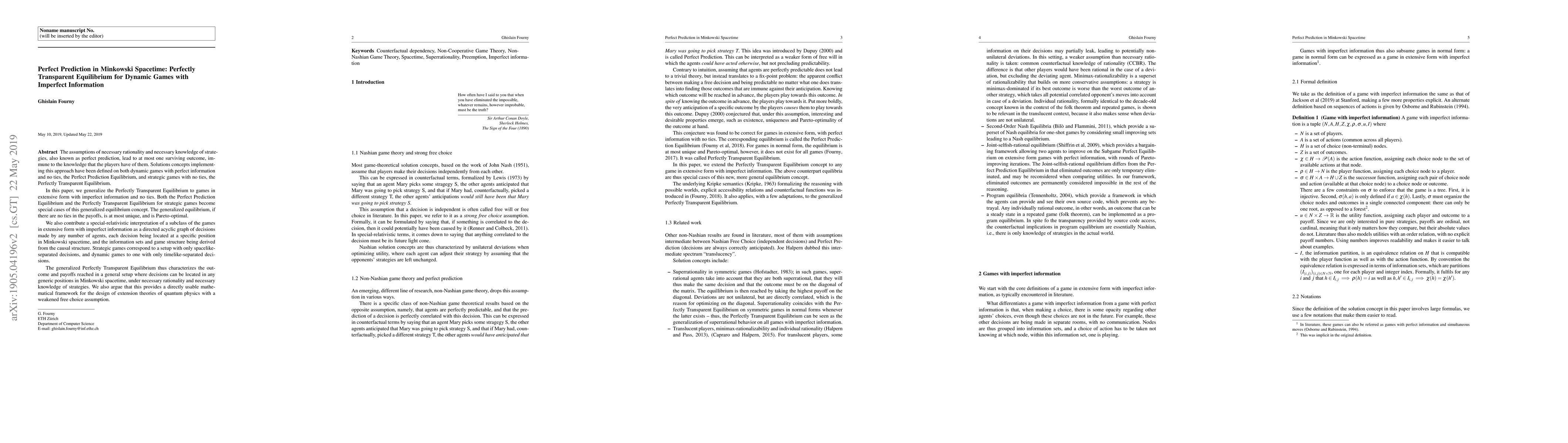 The assumptions of necessary rationality and necessary knowledge of strategies, also known as perfect prediction, lead to at most one surviving outcome, immune to the knowledge that the players have of them. Solutions concepts implementing this approach have been defined on both dynamic games with perfect information and no ties, the Perfect Prediction Equilibrium, and strategic games with no ties, the Perfectly Transparent Equilibrium. In this paper, we generalize the Perfectly Transparent Equilibrium to games in extensive form with imperfect information and no ties. Both the Perfect Prediction Equilibrium and the Perfectly Transparent Equilibrium for strategic games become special cases of this generalized equilibrium concept. The generalized equilibrium, if there are no ties in the payoffs, is at most unique, and is Pareto-optimal. We also contribute a special-relativistic interpretation of a subclass of the games in extensive form with imperfect information as a directed acyclic graph of decisions made by any number of agents, each decision being located at a specific position in Minkowski spacetime, and the information sets and game structure being derived from the causal structure. Strategic games correspond to a setup with only spacelike-separated decisions, and dynamic games to one with only timelike-separated decisions. The generalized Perfectly Transparent Equilibrium thus characterizes the outcome and payoffs reached in a general setup where decisions can be located in any generic positions in Minkowski spacetime, under necessary rationality and necessary knowledge of strategies. We also argue that this provides a directly usable mathematical framework for the design of extension theories of quantum physics with a weakened free choice assumption.