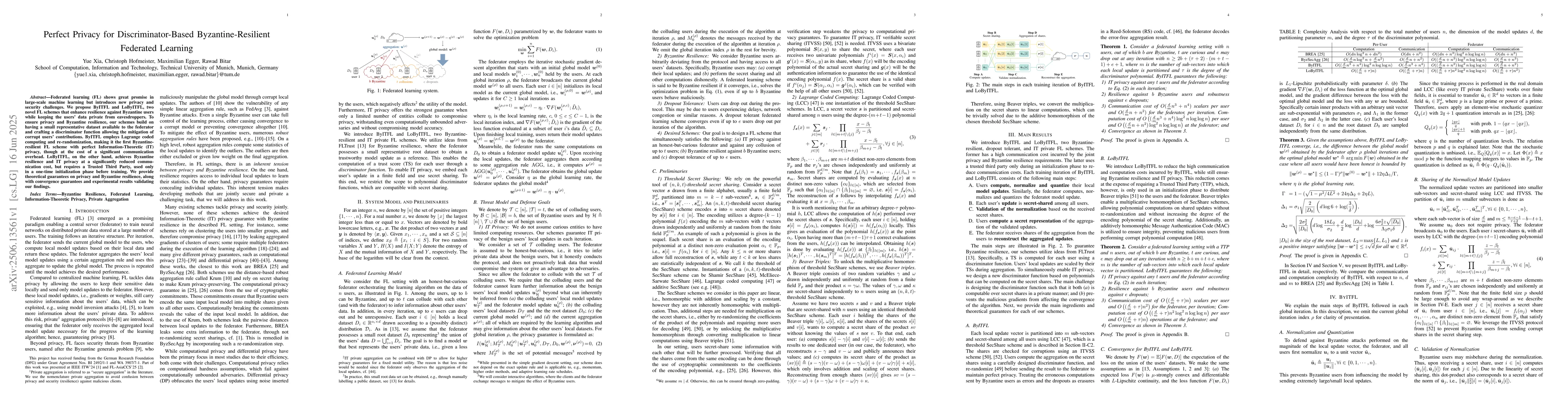 Federated learning (FL) shows great promise in large-scale machine learning but introduces new privacy and security challenges. We propose ByITFL and LoByITFL, two novel FL schemes that enhance resilience against Byzantine users while keeping the users' data private from eavesdroppers. To ensure privacy and Byzantine resilience, our schemes build on having a small representative dataset available to the federator and crafting a discriminator function allowing the mitigation of corrupt users' contributions. ByITFL employs Lagrange coded computing and re-randomization, making it the first Byzantine-resilient FL scheme with perfect Information-Theoretic (IT) privacy, though at the cost of a significant communication overhead. LoByITFL, on the other hand, achieves Byzantine resilience and IT privacy at a significantly reduced communication cost, but requires a Trusted Third Party, used only in a one-time initialization phase before training. We provide theoretical guarantees on privacy and Byzantine resilience, along with convergence guarantees and experimental results validating our findings.