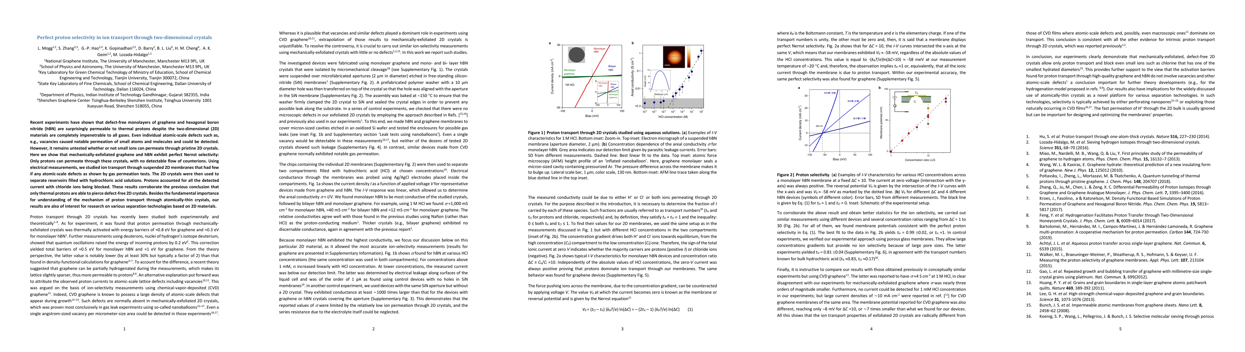 Researchers found that graphene and hexagonal boron nitride crystals can selectively allow protons to pass through while blocking counterions, demonstrating perfect Nernst selectivity.