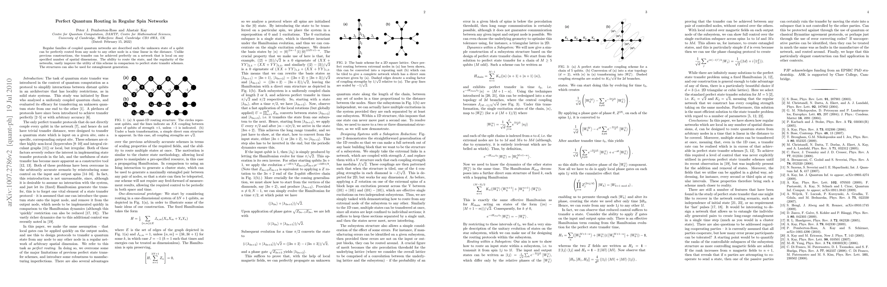 This paper presents a novel method for perfect quantum routing in regular spin networks, enabling the precise transfer of qubit states across any distance in linear time, while maintaining local spatial dimensions and enhancing network utility and entanglement generation capabilities.