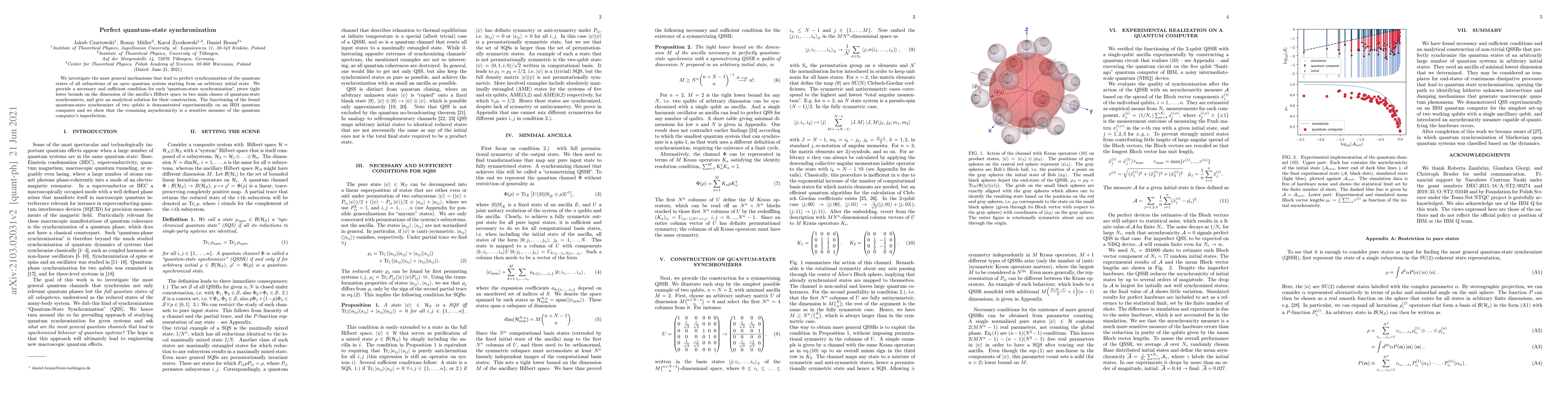 We investigate the most general mechanisms that lead to perfect synchronization of the quantum states of all subsystems of an open quantum system starting from an arbitrary initial state. We provide a necessary and sufficient condition for such "quantum-state synchronization", prove tight lower bounds on the dimension of the environment's Hilbert space in two main classes of quantum-state synchronizers, and give an analytical solution for their construction. The functioning of the found quantum-state synchronizer of two qubits is demonstrated experimentally on an IBM quantum computer and we show that the remaining asynchronicity is a sensitive measure of the quantum computer's imperfection.
