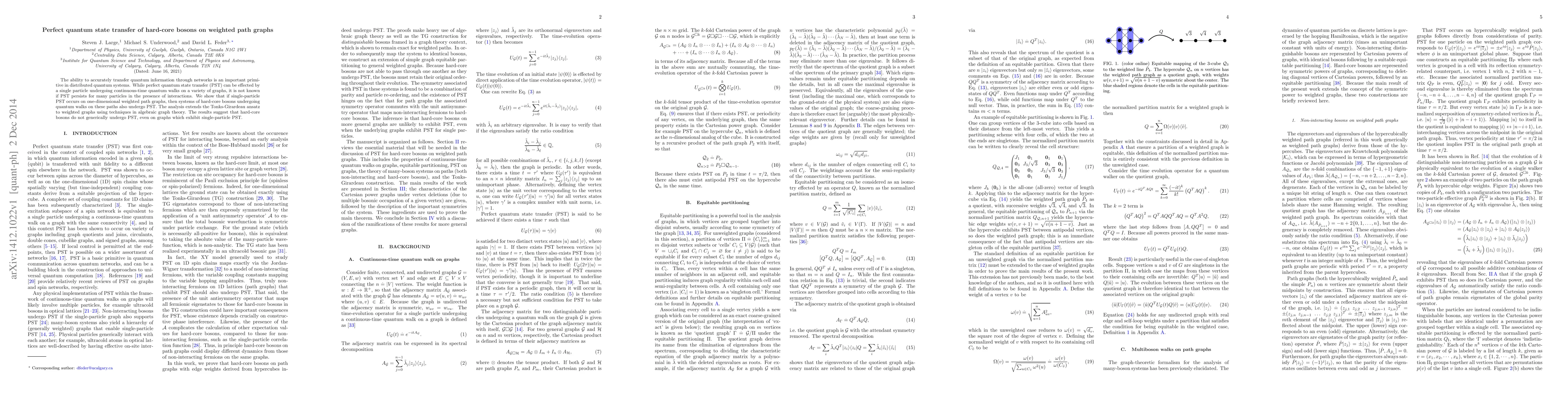 This paper demonstrates that perfect quantum state transfer (PST) can occur for systems of hard-core bosons on weighted path graphs, provided that single-particle PST is achievable. The study extends the Tonks-Girardeau ansatz to these graphs and reveals that hard-core bosons do not generally undergo PST, even on graphs where single-particle PST is possible.