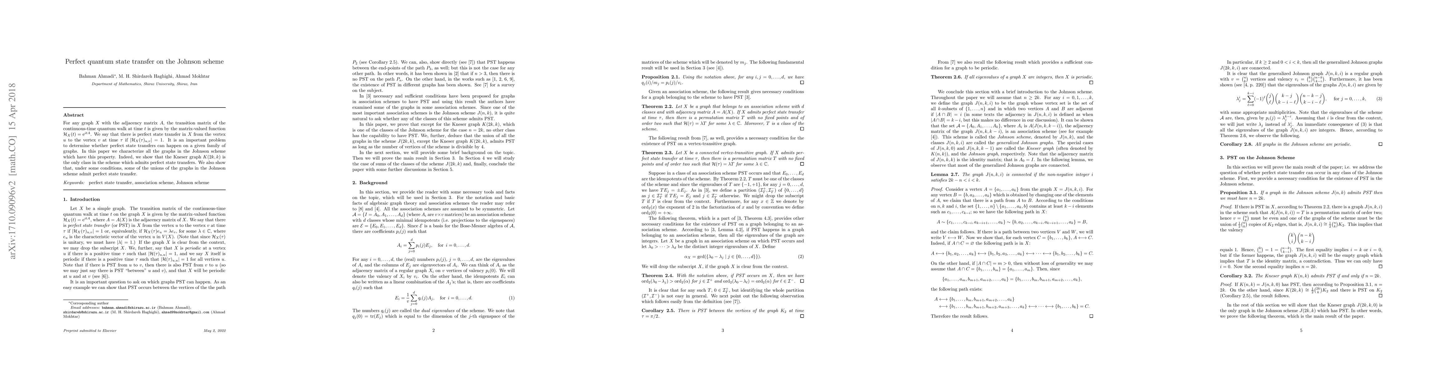 This paper characterizes graphs in the Johnson scheme that allow perfect quantum state transfer, identifying the Kneser graph $K(2k,k)$ as the sole class within the scheme with this property. Additionally, it explores the possibility of perfect state transfer in unions of certain graphs within the Johnson scheme under specific conditions.