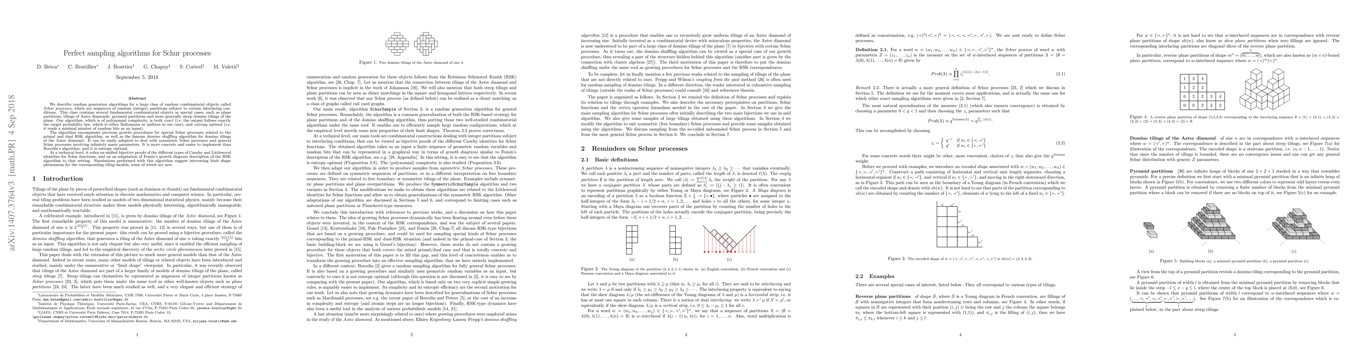 We describe random generation algorithms for a large class of random combinatorial objects called Schur processes, which are sequences of random (integer) partitions subject to certain interlacing conditions. This class contains several fundamental combinatorial objects as special cases, such as plane partitions, tilings of Aztec diamonds, pyramid partitions and more generally steep domino tilings of the plane. Our algorithm, which is of polynomial complexity, is both exact (i.e. the output follows exactly the target probability law, which is either Boltzmann or uniform in our case), and entropy optimal (i.e. it reads a minimal number of random bits as an input). The algorithm encompasses previous growth procedures for special Schur processes related to the primal and dual RSK algorithm, as well as the famous domino shuffling algorithm for domino tilings of the Aztec diamond. It can be easily adapted to deal with symmetric Schur processes and general Schur processes involving infinitely many parameters. It is more concrete and easier to implement than Borodin's algorithm, and it is entropy optimal. At a technical level, it relies on unified bijective proofs of the different types of Cauchy and Littlewood identities for Schur functions, and on an adaptation of Fomin's growth diagram description of the RSK algorithm to that setting. Simulations performed with this algorithm suggest interesting limit shape phenomena for the corresponding tiling models, some of which are new.
