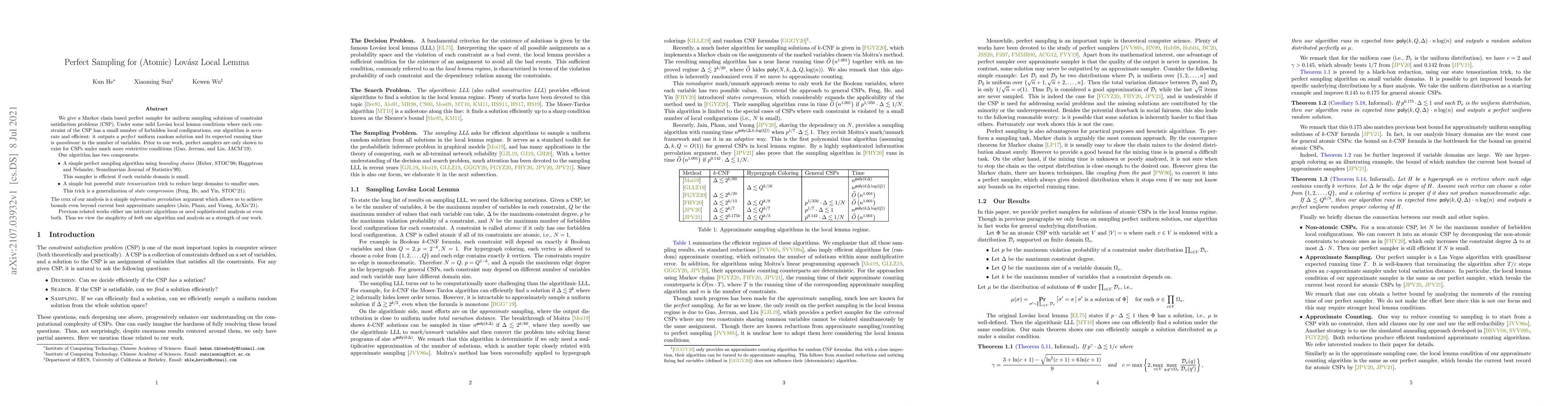 We give a Markov chain based perfect sampler for uniform sampling solutions of constraint satisfaction problems (CSP). Under some mild Lov\'asz local lemma conditions where each constraint of the CSP has a small number of forbidden local configurations, our algorithm is accurate and efficient: it outputs a perfect uniform random solution and its expected running time is quasilinear in the number of variables. Prior to our work, perfect samplers are only shown to exist for CSPs under much more restrictive conditions (Guo, Jerrum, and Liu, JACM'19). Our algorithm has two components: 1. A simple perfect sampling algorithm using bounding chains (Huber, STOC'98; Haggstrom and Nelander, Scandinavian Journal of Statistics'99). This sampler is efficient if each variable domain is small. 2. A simple but powerful state tensorization trick to reduce large domains to smaller ones. This trick is a generalization of state compression (Feng, He, and Yin, STOC'21). The crux of our analysis is a simple information percolation argument which allows us to achieve bounds even beyond current best approximate samplers (Jain, Pham, and Vuong, ArXiv'21). Previous related works either use intricate algorithms or need sophisticated analysis or even both. Thus we view the simplicity of both our algorithm and analysis as a strength of our work.