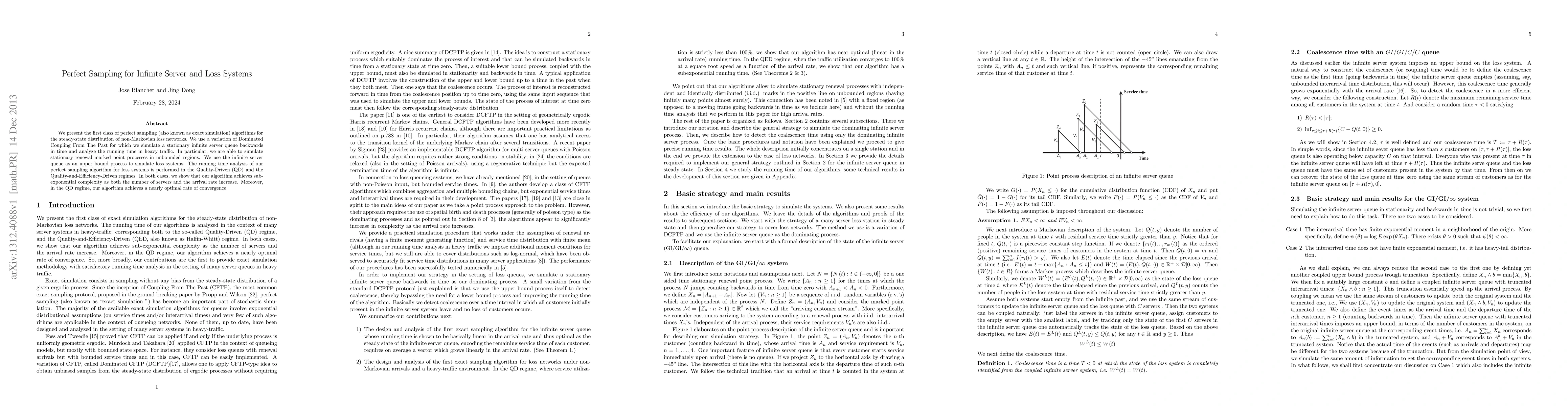 We present the first class of perfect sampling (also known as exact simulation) algorithms for the steady-state distribution of non-Markovian loss networks. We use a variation of Dominated Coupling From The Past for which we simulate a stationary infinite server queue backwards in time and analyze the running time in heavy traffic. In particular, we are able to simulate stationary renewal marked point processes in unbounded regions. We use the infinite server queue as an upper bound process to simulate loss systems. The running time analysis of our perfect sampling algorithm for loss systems is performed in the Quality-Driven (QD) and the Quality-and-Efficiency-Driven regimes. In both cases, we show that our algorithm achieves sub-exponential complexity as both the number of servers and the arrival rate increase. Moreover, in the QD regime, our algorithm achieves a nearly optimal rate of convergence.