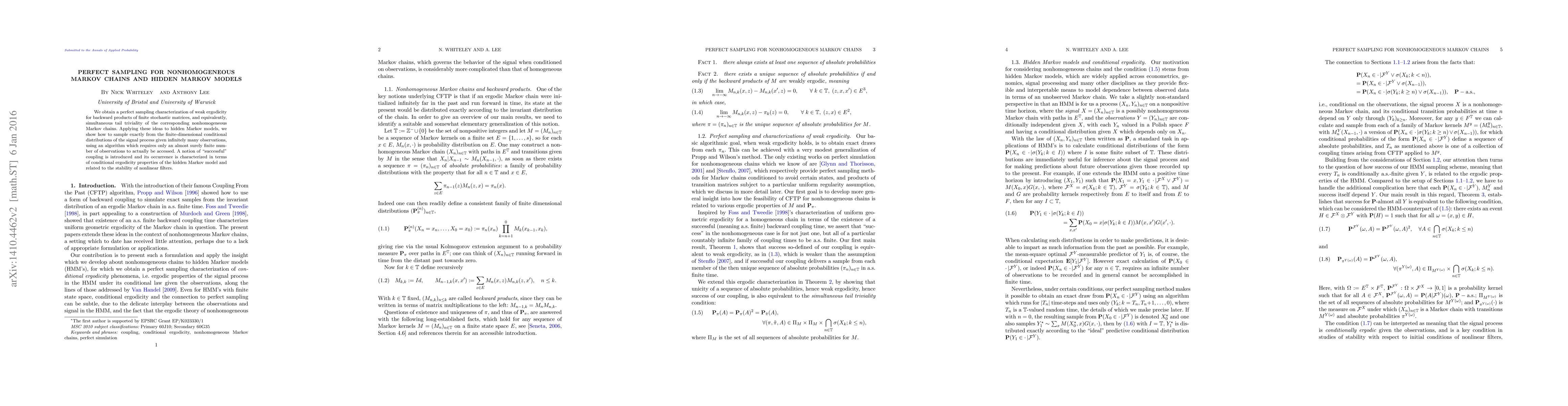 This paper presents a perfect sampling method for nonhomogeneous Markov chains and hidden Markov models, demonstrating how to exactly sample from conditional distributions using a coupling algorithm that requires a finite number of observations. It introduces a "successful" coupling concept linked to the conditional ergodicity and stability of nonlinear filters.