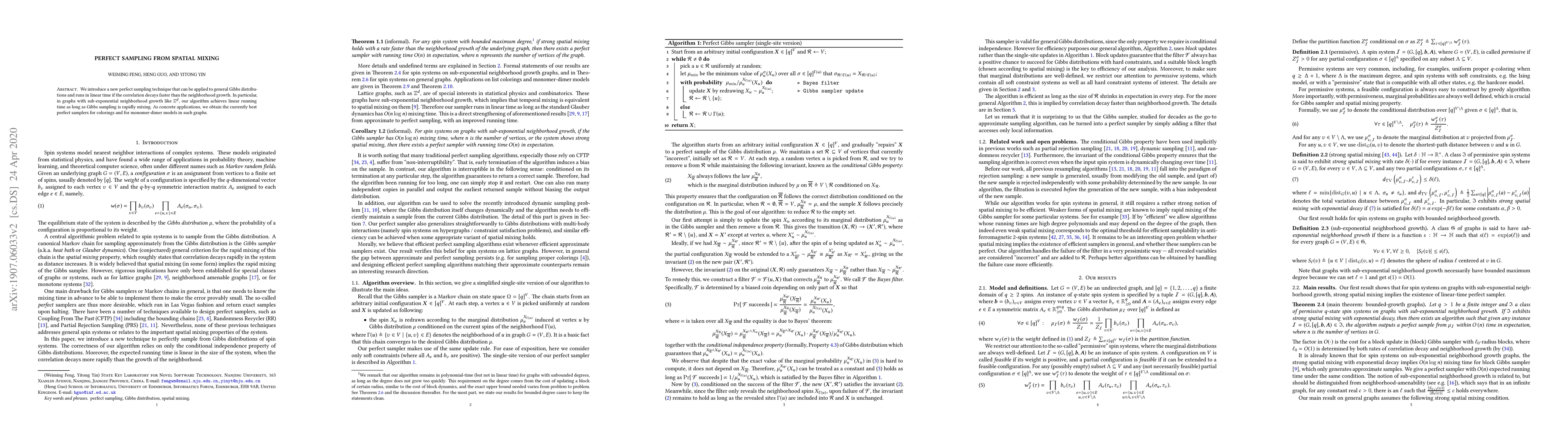 The paper presents a linear-time perfect sampling algorithm for permissive Gibbs distributions under spatial mixing conditions.
