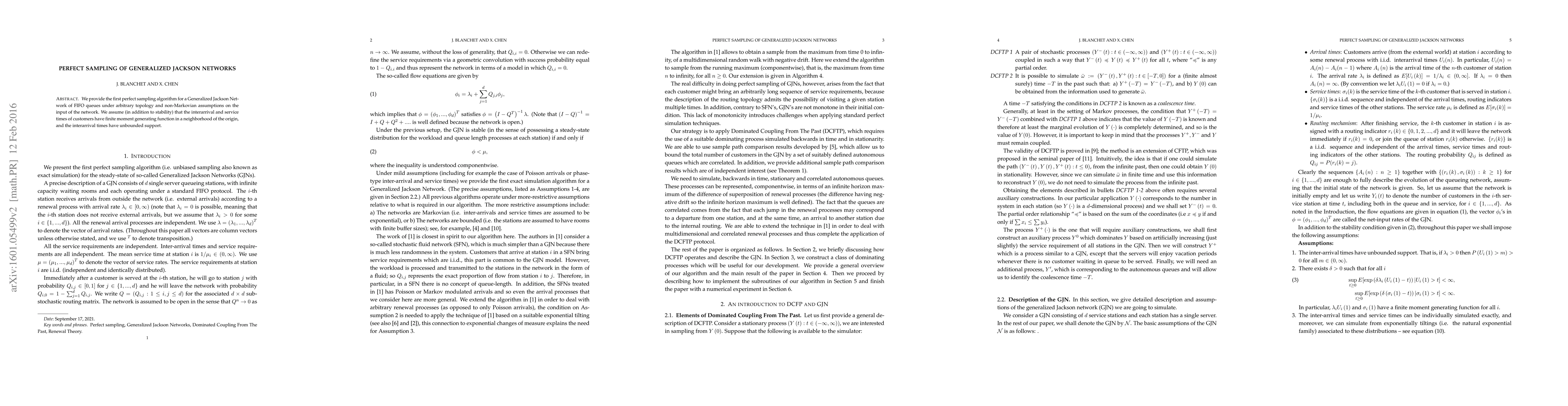 This paper introduces the first perfect sampling algorithm for Generalized Jackson Networks with FIFO queues, applicable to any topology and non-Markovian input conditions. It assumes finite moment generating functions for interarrival and service times, alongside unbounded interarrival time support.
