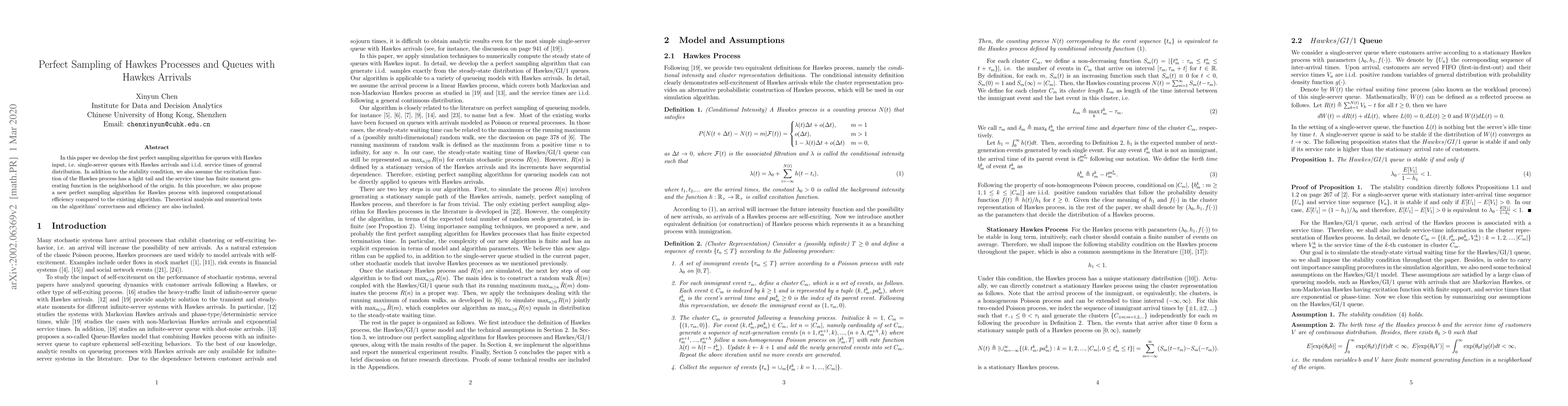 This paper introduces a new perfect sampling algorithm for single-server queues with Hawkes arrivals and general service time distributions, improving computational efficiency. The algorithm also applies to Hawkes processes under light-tailed excitation functions and finite moment generating functions, supported by theoretical analysis and numerical tests.