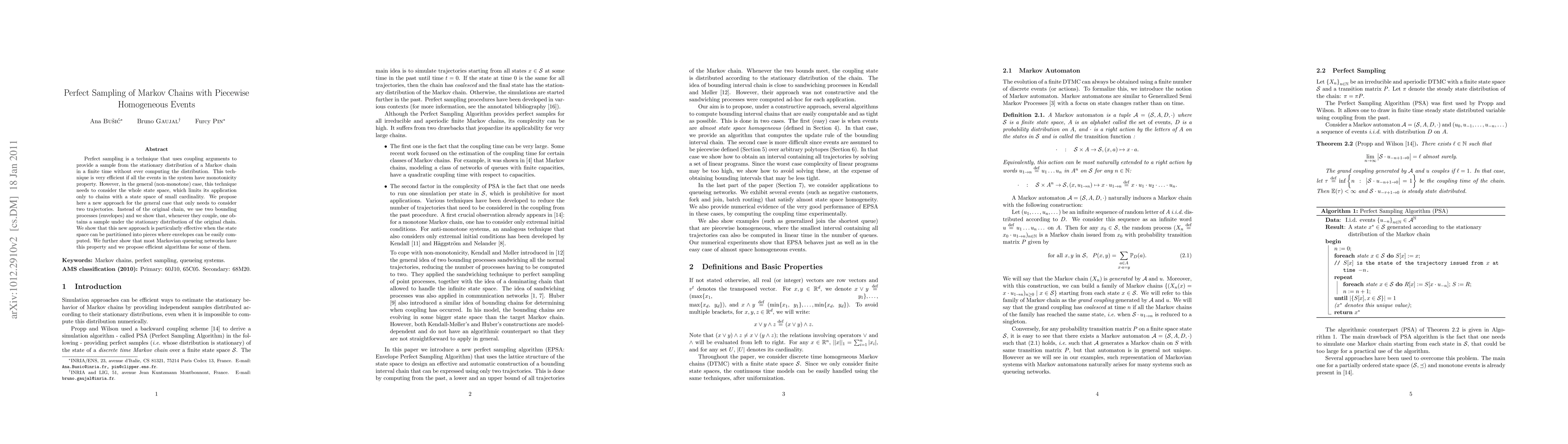 This paper proposes a new perfect sampling technique for Markov chains with piecewise homogeneous events, using two bounding processes to efficiently sample from the stationary distribution without computing the distribution. The method is particularly effective for chains where the state space can be partitioned into manageable pieces.