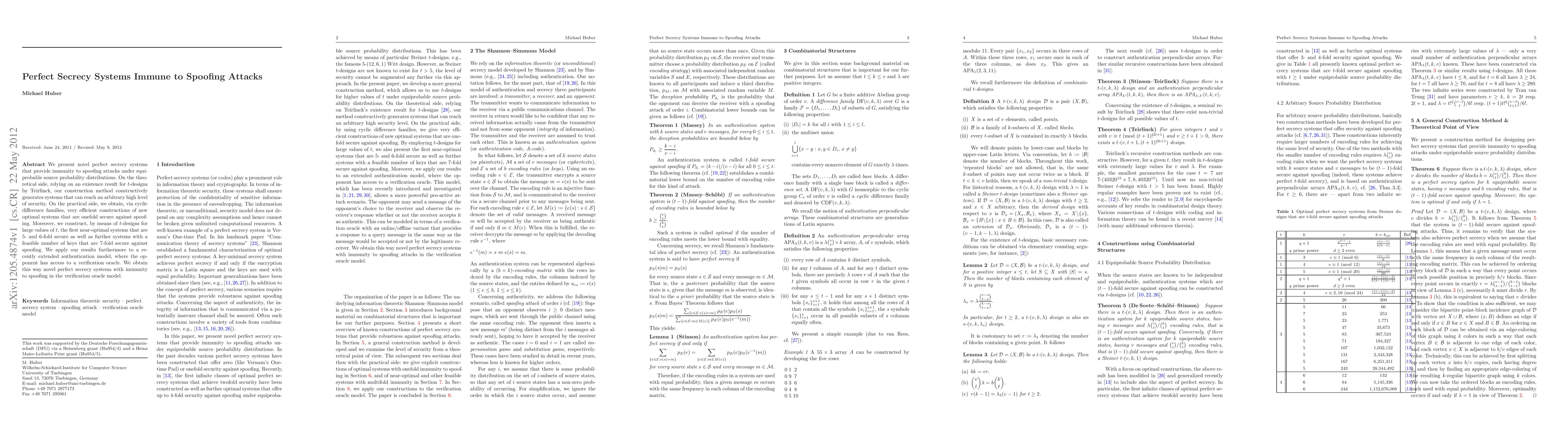 This paper introduces novel perfect secrecy systems that are immune to spoofing attacks, leveraging theoretical constructs based on $t$-designs and practical cyclic difference families. It provides efficient, optimal systems that are secure against spoofing, along with near-optimal and feasible systems for higher security levels, and extends these results to an authentication model with verification oracle access.